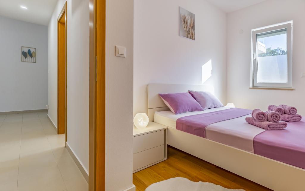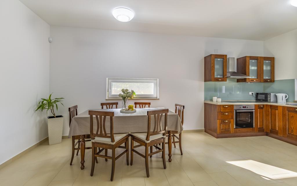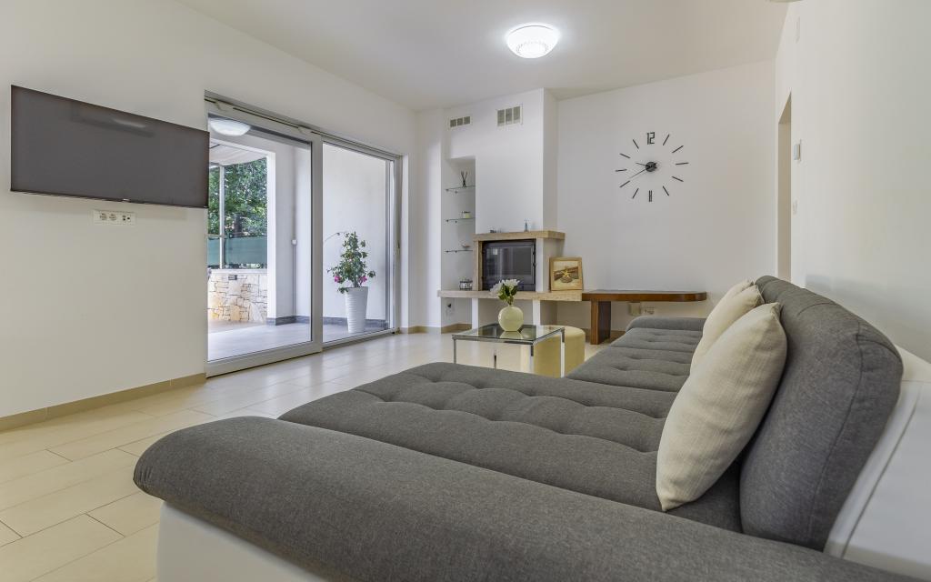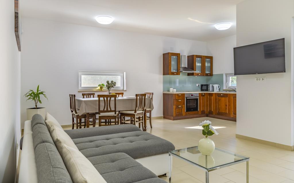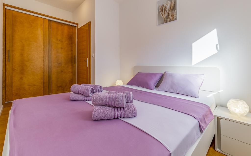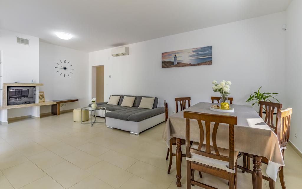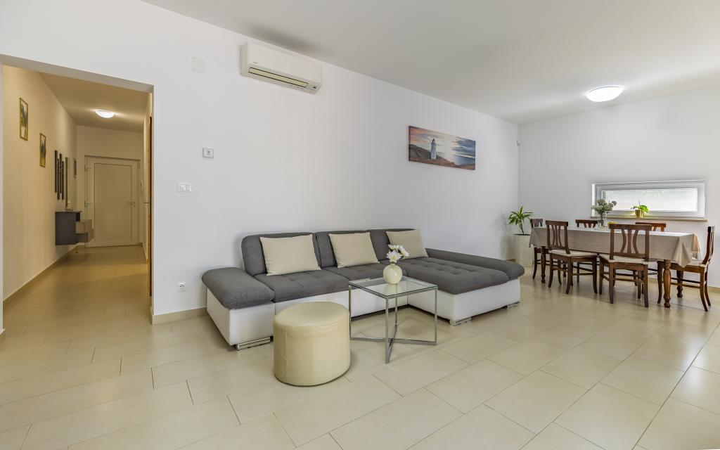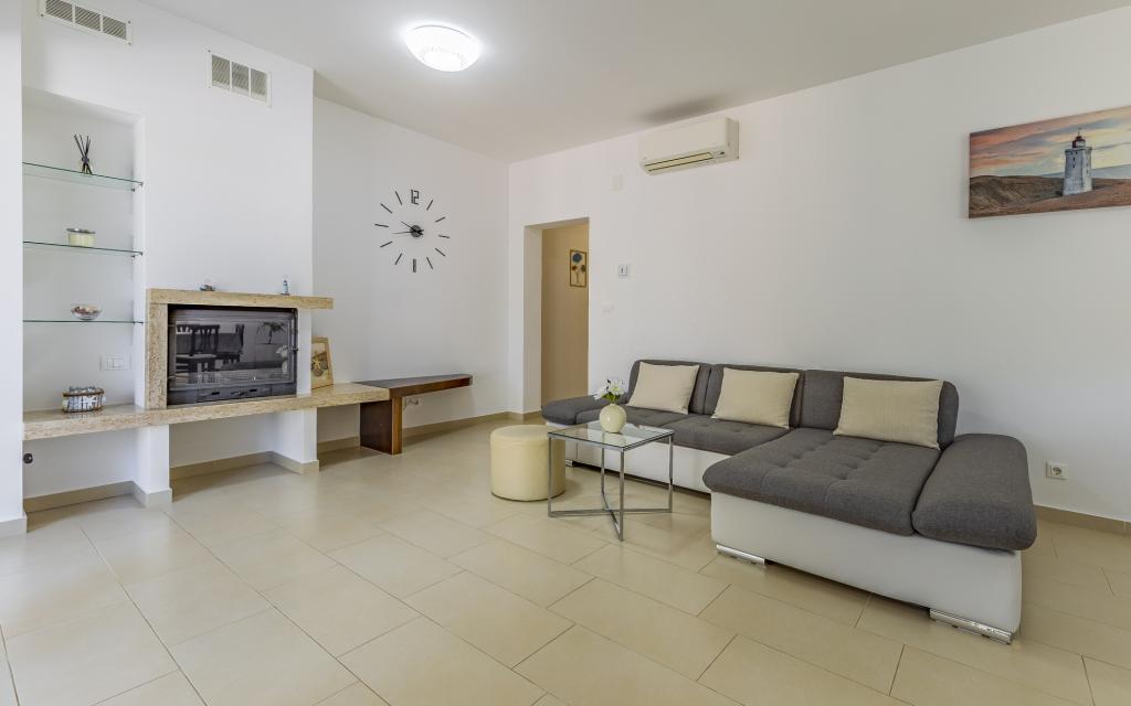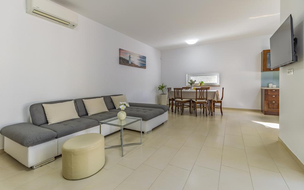 Teljesen és a standardon felül berendezett apartman (80 m2) kiváló helyen, Banjol csendes részén, mindössze 5 perc (300 m) sétára a környék legszebb strandjaitól. Az apartman egy három apartmanból álló lakóépület földszintjén található. Az apartmanhoz saját kert (100 m2) tartozik terasszal, asztallal, nyugágyakkal, kültéri zuhanyzóval és grillezővel, amely kellemes társasági életet és nagyfokú magánéletet tesz lehetővé, és különösen alkalmas gyermekes családok számára. Az épület mellett saját parkoló található, közvetlen hozzáféréssel a kerthez és a teraszhoz. A kertet 2024-ben teljesen felújították. Az egész épületet biztonsági kerítés védi (kártyás beléptetés). Az apartmanban 2 hálószoba található dupla ággyal, 2 fürdőszoba WC-vel és zuhanyzóval, tágas nappali kihúzható kanapéval, étkező és konyha. Az apartman légkondicionált és télen fűthető (padlófűtés), valamint beltéri kandallóval rendelkezik, így alkalmas az őszi és téli hidegebb hónapokban való tartózkodásra is. Az apartman közvetlen közelében számos bár és étterem, valamint díszes üzlet található.