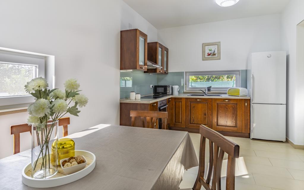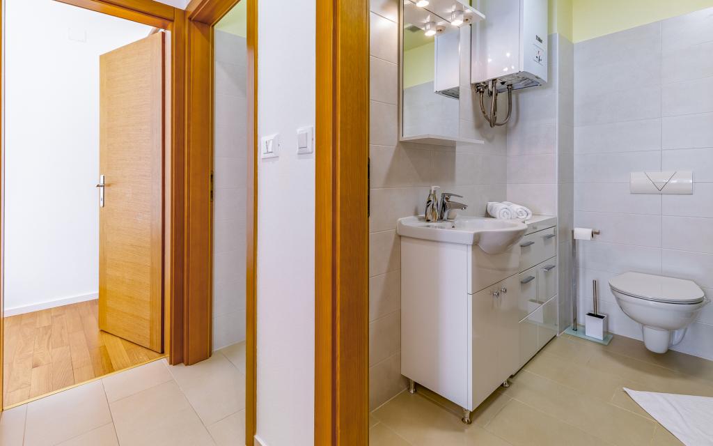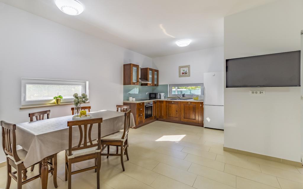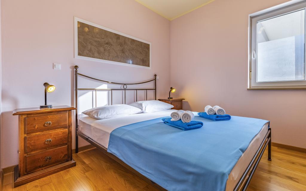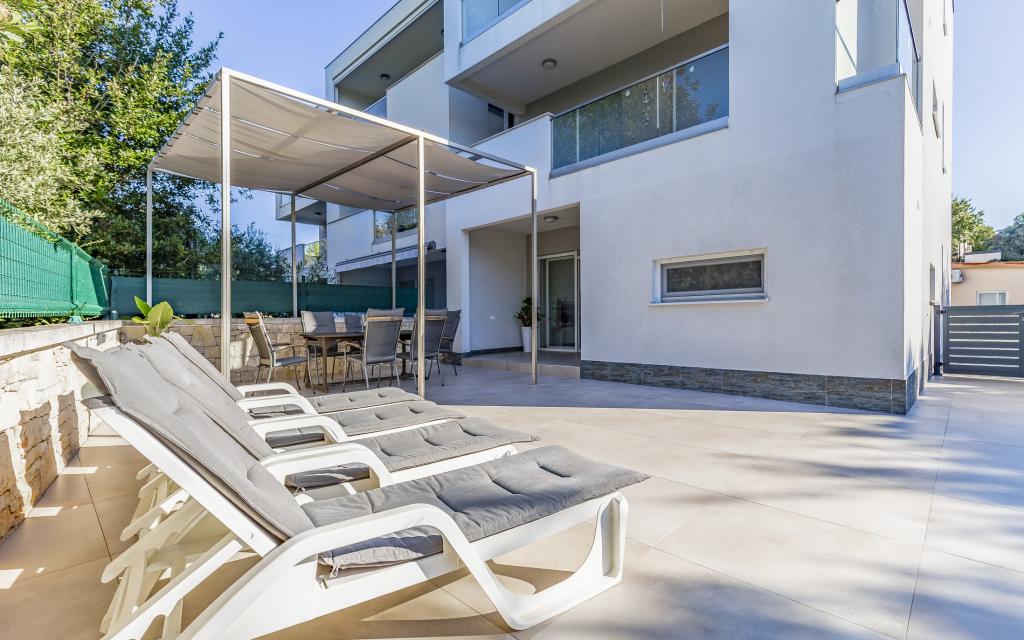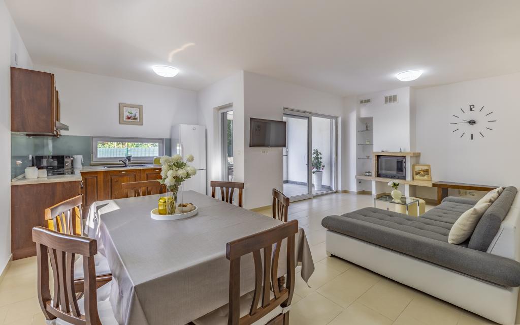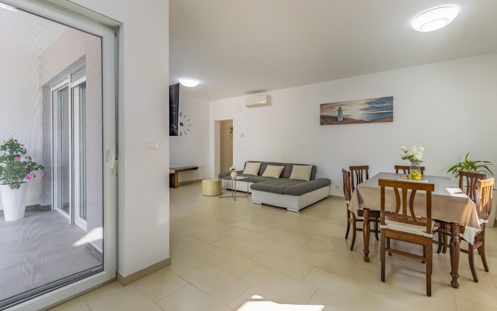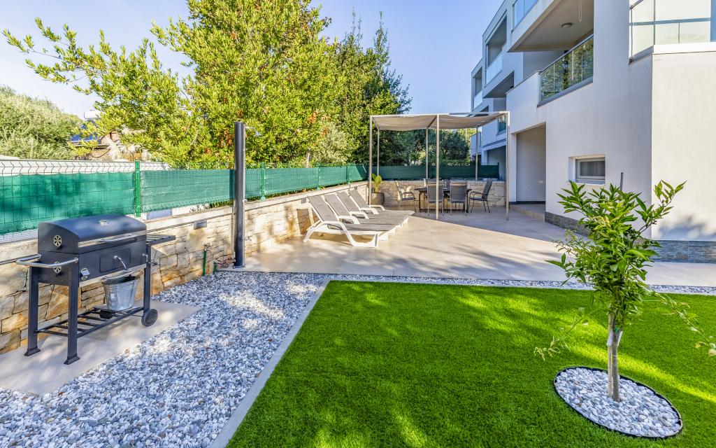 Teljesen és a standardon felül berendezett apartman (80 m2) kiváló helyen, Banjol csendes részén, mindössze 5 perc (300 m) sétára a környék legszebb strandjaitól. Az apartman egy három apartmanból álló lakóépület földszintjén található. Az apartmanhoz saját kert (100 m2) tartozik terasszal, asztallal, nyugágyakkal, kültéri zuhanyzóval és grillezővel, amely kellemes társasági életet és nagyfokú magánéletet tesz lehetővé, és különösen alkalmas gyermekes családok számára. Az épület mellett saját parkoló található, közvetlen hozzáféréssel a kerthez és a teraszhoz. A kertet 2024-ben teljesen felújították. Az egész épületet biztonsági kerítés védi (kártyás beléptetés). Az apartmanban 2 hálószoba található dupla ággyal, 2 fürdőszoba WC-vel és zuhanyzóval, tágas nappali kihúzható kanapéval, étkező és konyha. Az apartman légkondicionált és télen fűthető (padlófűtés), valamint beltéri kandallóval rendelkezik, így alkalmas az őszi és téli hidegebb hónapokban való tartózkodásra is. Az apartman közvetlen közelében számos bár és étterem, valamint díszes üzlet található.