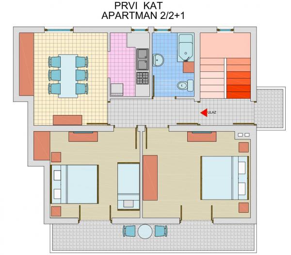 Családi ház, ahol a lakás található, a város központjában, az erdő szélén Park Soline, ahol a fő strand, teniszpálya, disco és egyéb szórakozási lehetőségek. A házban három apartman és egy stúdió apartman két fő részére, egy stúdió apartman négy személynek és egy apartman két hálószobával, összesen öt embert. Apartmanok felszereltsége minden szükséges alapvető eszközök és segédeszközök. A lakás be van kapcsolva Wi-Fi-vel, minden lakás rendelkezik erkéllyel és légkondicionálóval. Az udvar egy barbecue. Korištelnje barbecue ingyenes. Lehetőség van a park egy garázs és egy parkolóhely a ház mellett, és a többi parkoló a ház közelében.