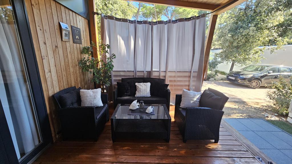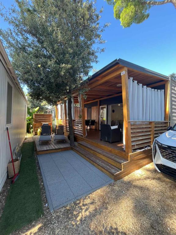 Modern, légkondicionált mobilház a Park Soline kempingben, mindössze pár lépésre a strandtól és 15 perc sétára Biograd központjától. 2 hálószobával, konyhával, nappalival, 2 fürdőszobával és fedett terasszal, kerti bútorokkal. Ingyenes Wi-Fi, parkoló, gyermekprogramok, sportpályák és mediterrán étterem a helyszínen. Tökéletes családok vagy párok számára, akik fenyőfák árnyékában szeretnének kikapcsolódni, közel a főbb látnivalókhoz.