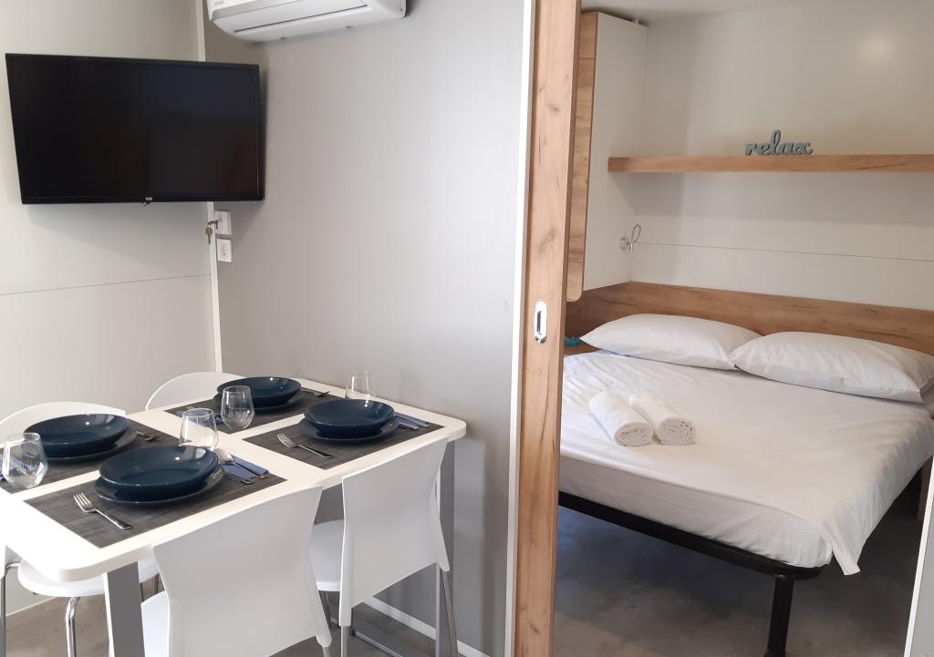 A Soline kemping csendes részén, egy fenyveserdőben található modern InnMare 781 mobilház tökéletes hely egy családi nyaraláshoz. 32 m2-es alapterületével egy franciaággyal ellátott hálószobából, egy két egyszemélyes ággyal ellátott hálószobából, egy kihúzható ággyal (1-2 fő részére) ellátott nappaliból, egy WC-vel ellátott fürdőszobából, egy 32 m2-es teraszból, egy kis udvarból és egy parkolóhelyből áll. Az ingatlan teljesen berendezett, a konyhában az alapfelszereltség mellett mikrohullámú sütő, vízforraló és eszpresszógép is található. A teraszon egy további étkezőasztal, nyugágyak találhatók a tökéletes szunyókáláshoz, fenyőfák illatával fűszerezve, az ingatlan mellett pedig egy elektromos grillpult található, amely szintén a vendégek által használható felszereltség szerves részét képezi. Az ingatlan mellett egy autó számára parkolóhely is található, amelyet a vendégek használhatnak. Üdvözöljük az InnMare 781-ben, egy modern ingatlanban, amely békés és idilli családi nyaralásra lett tervezve egy csendes fenyveserdőben, a tenger, a strandok és Biograd na moru könnyű elérhetőségével!