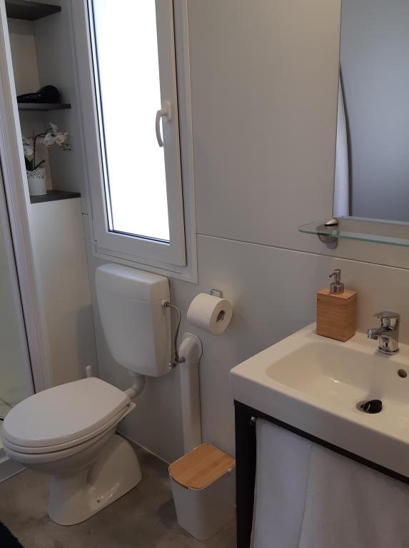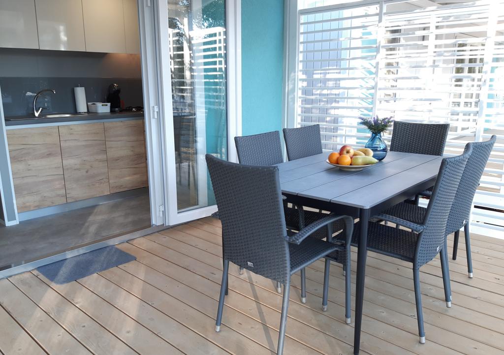 A Soline kemping csendes részén, egy fenyveserdőben található modern InnMare 792 mobilház tökéletes hely egy családi nyaraláshoz. 32 m2-es alapterületével egy franciaággyal ellátott hálószobából, egy két egyszemélyes ággyal ellátott hálószobából, egy kihúzható ággyal (1-2 fő részére) ellátott nappaliból, egy WC-vel ellátott fürdőszobából, egy 32 m2-es teraszból, egy kis udvarból és egy parkolóhelyből áll. Az ingatlan teljesen berendezett, a konyhában az alapfelszereltség mellett mikrohullámú sütő, vízforraló és eszpresszógép is található. A teraszon egy további étkezőasztal, nyugágyak találhatók a tökéletes szunyókáláshoz, fenyőfák illatával fűszerezve, az ingatlan mellett pedig egy elektromos grillpult található, amely szintén a vendégek által használható felszereltség szerves részét képezi. Az ingatlan mellett egy autó számára parkolóhely is található, amelyet a vendégek használhatnak. Üdvözöljük az InnMare 792-ben, egy modern ingatlanban, amely békés és idilli családi nyaralásra lett tervezve egy csendes fenyveserdőben, a tenger, a strandok és Biograd na moru közelében!