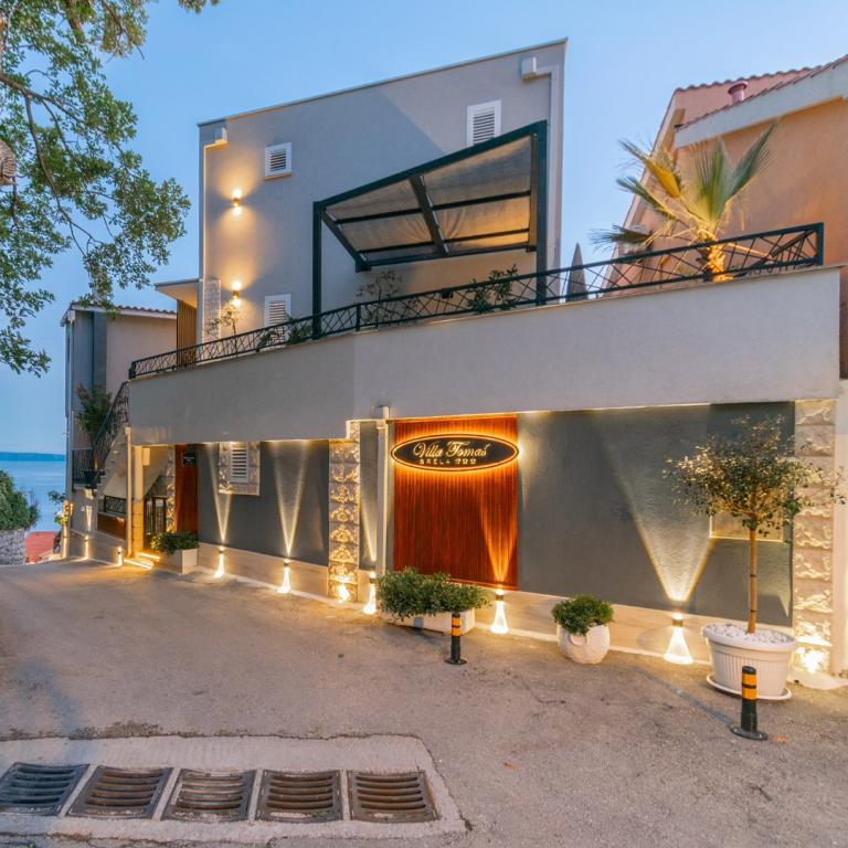 A Villa Tomaš Brela csendes környéken található, 2 km-re Brela központjától. Az 1-es apartman 6 + 2 fő részére, a kis ház, azaz a 2-es apartman pedig 2 fő részére alkalmas. Az apartmanok teljesen felszereltek, így gondtalanul élvezheti nyaralását. Az 1-es apartman egy kétszintes apartman, 4 hálószobával, 2 konyhával, 2 fürdőszobával és egy terasszal. A 2-es apartmanban konyha, hálószoba, fürdőszoba és erkély található. A Villa Tomaš vendégei rendelkezésére áll egy medence és egy pezsgőfürdő. Ingyenes parkolási lehetőség áll rendelkezésre a szálláshely mellett. A Podcrkavlje strand 200 méterre található az apartmantól, akárcsak az első étterem és a strandbár.