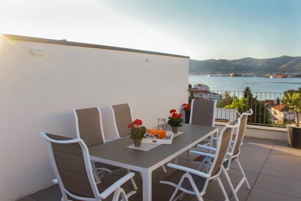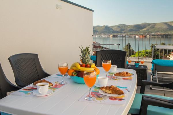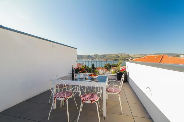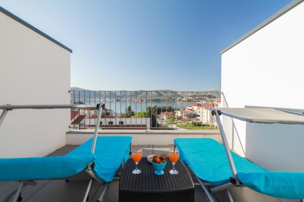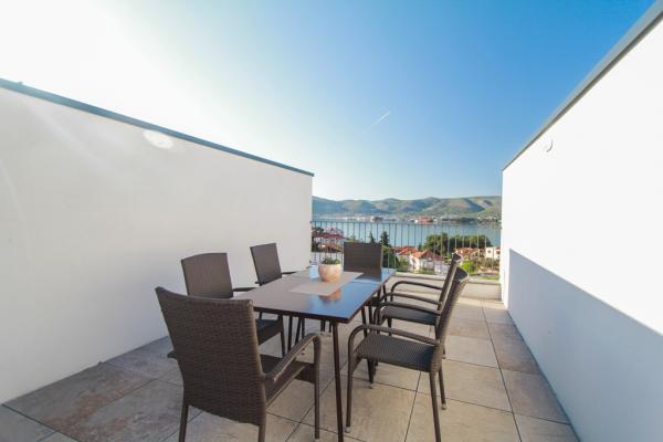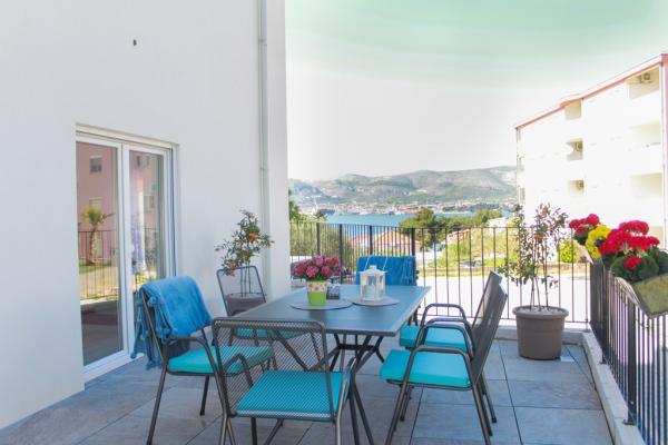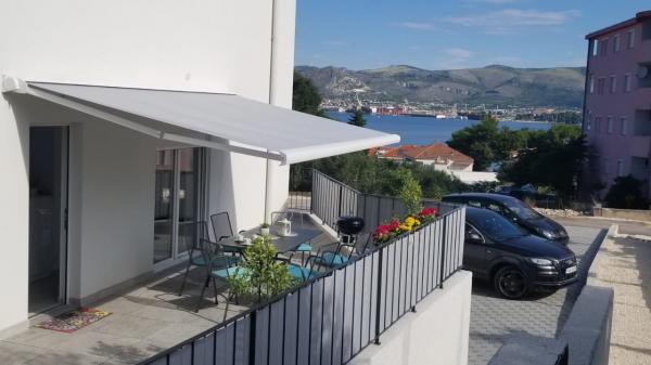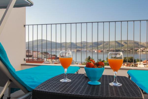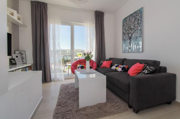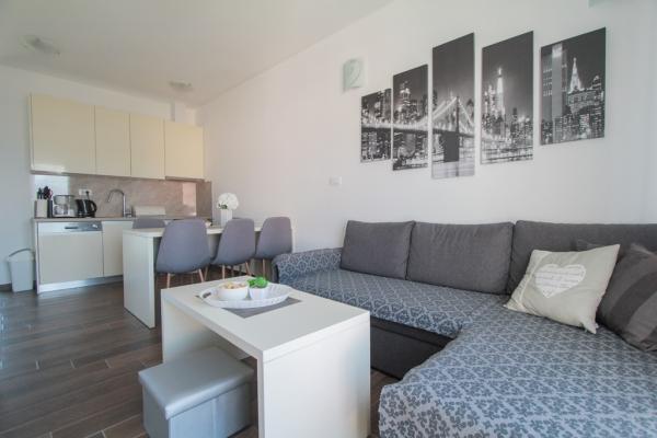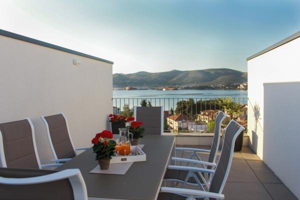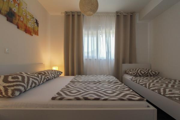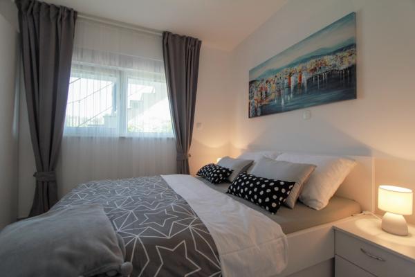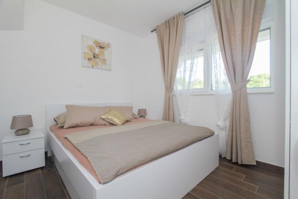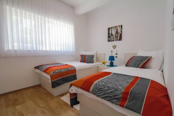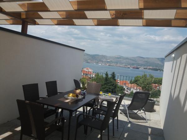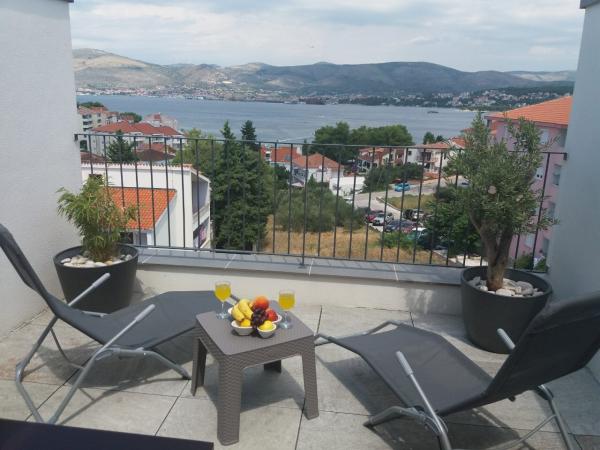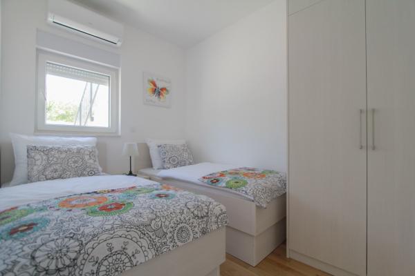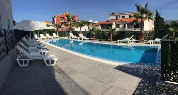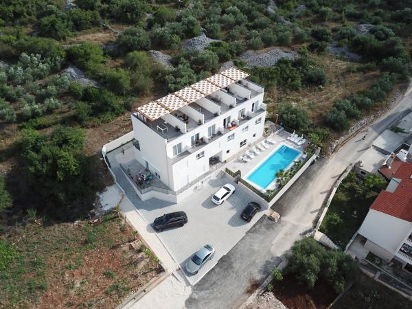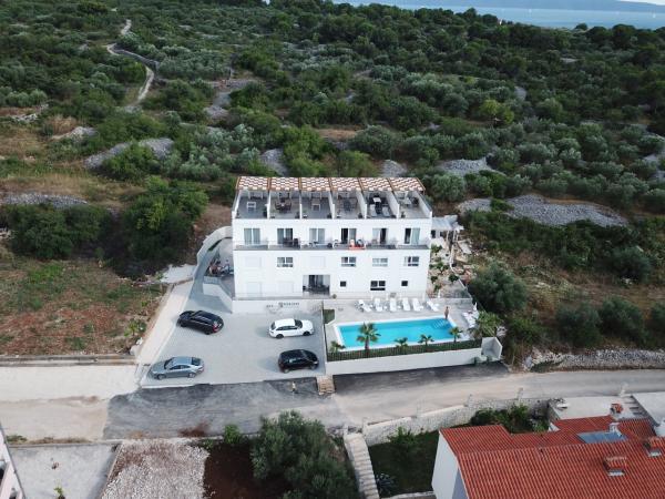 Az új két hálószobás apartmanok Okrug Gornji csendes részén találhatók, mindössze 5 perc sétára a strandtól az Okruška-öbölben és 10 perc sétára Tatinje strandjától. . Az apartmanok modern berendezésűek, teljesen felszerelt konyhával. A hat emeletes lakosztályok mindegyike saját, 25 m2-es tetőterasszal rendelkezik, ahonnan gyönyörű kilátás nyílik a tengerre, valamint grillező és ülőgarnitúra található. A földszinten két apartman tengerre néző terasszal, grillezővel és ülőbútorokkal rendelkezik. Az épület előtt egy 50 m2-es sós vízzel felszerelt medence található. Májusban és októberben a medencében a víz felmelegszik. Beplatan wifi. Az épület udvarán egy parkolóhely található minden apartmanhoz.