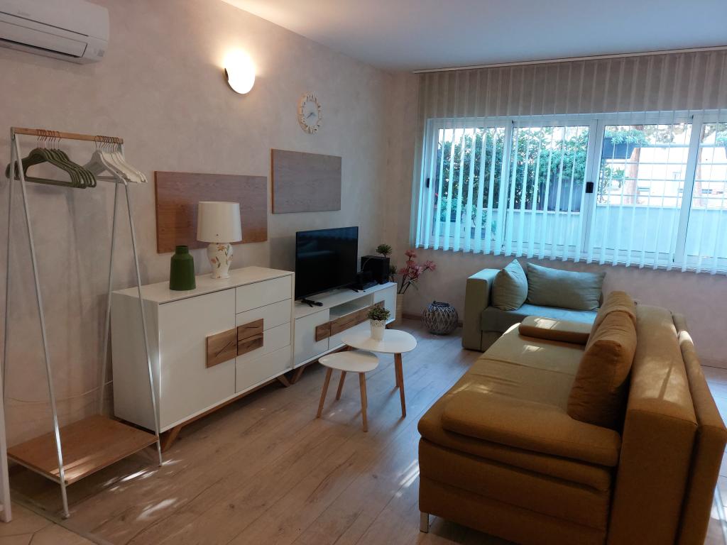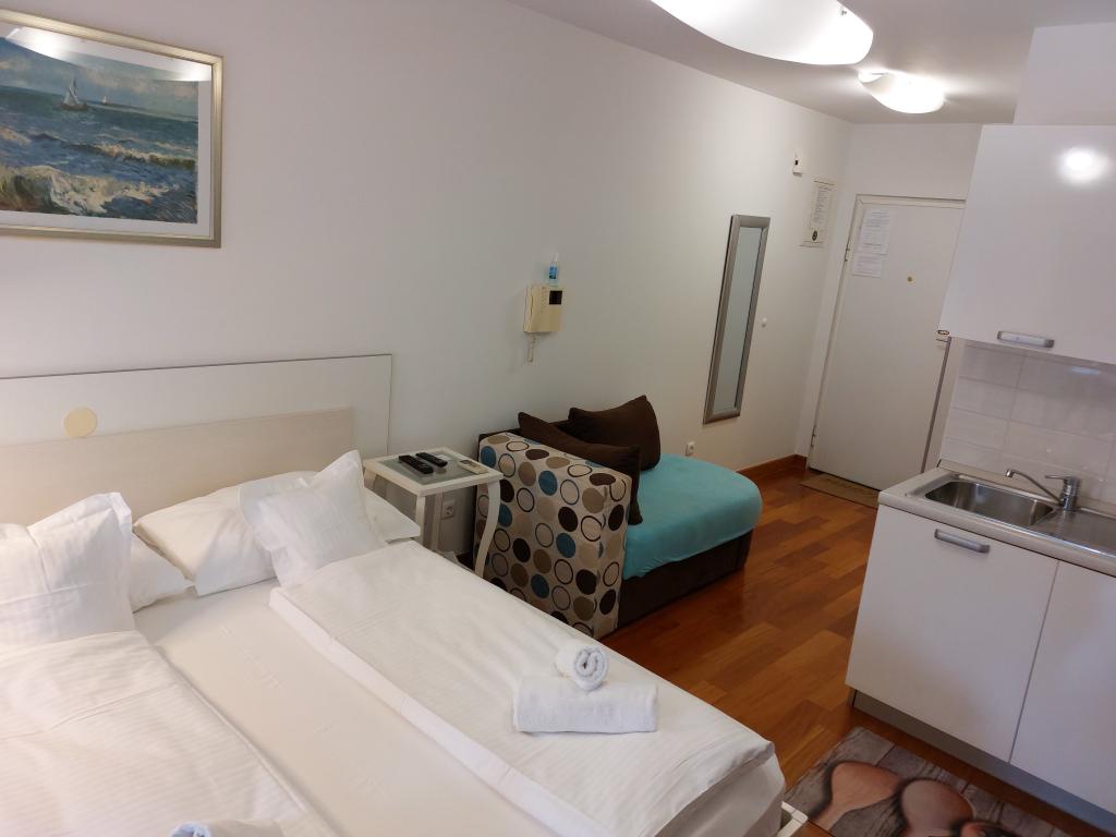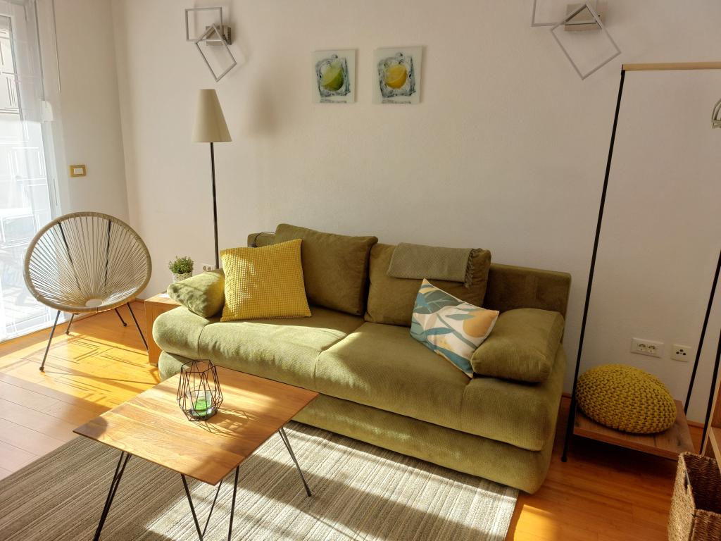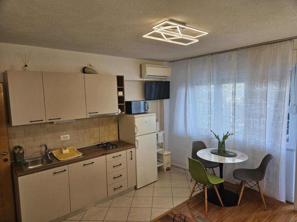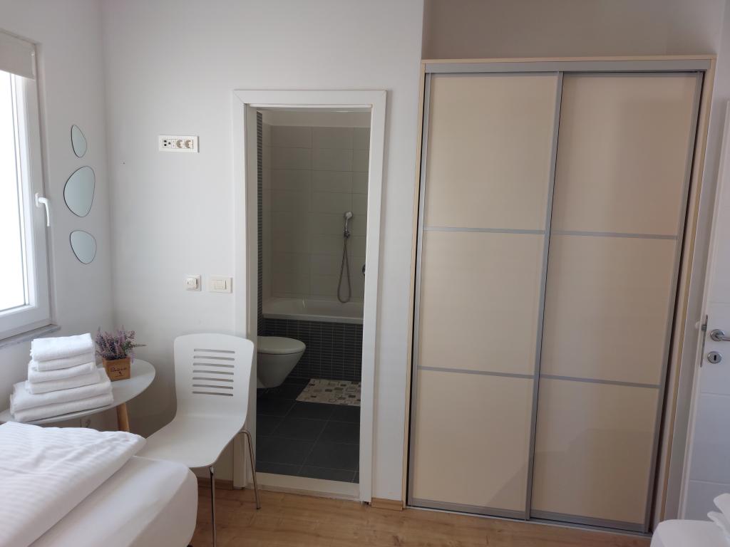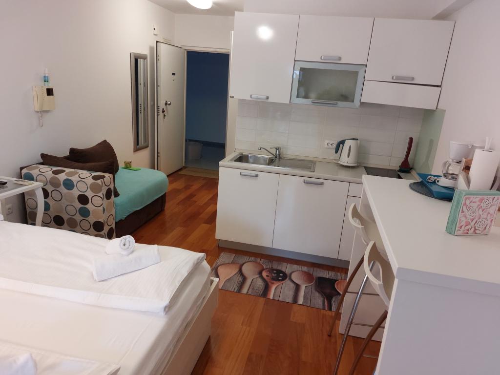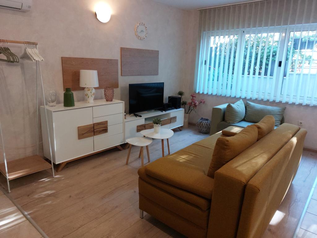 Apartmanjaink modernek és teljesen felszereltek, hogy tartózkodása a lehető legkényelmesebb és leggondtalanabb legyen. Minden apartmanban vasaló és vasalódeszka, hajszárító, filteres kávéfőző, vízforraló és mikrohullámú sütő található. A vendégek rendelkezésére állnak az ételek elkészítéséhez és tálalásához szükséges összes eszköz. Minden szállásegység síkképernyős TV-vel, ingyenes Wi-Fi-vel, beltéri és kültéri ülő- és pihenősarokkal felszerelt. A szállásegységek légkondicionáltak. A parkolást előre kell foglalni a létesítményen belüli korlátozott parkolóhelyek száma miatt. Érkezéskor friss ágynemű és törölközők várják Önt, amelyeket megbeszélés szerint cserélnek. Gyermekágy előzetes bejelentkezés alapján ingyenesen bérelhető. A létesítményen belül egy közös udvar található ülőbútorokkal, mediterrán növényekkel körülvéve - ideális hely a kikapcsolódásra. A létesítmény csendes környéken található, a tengertől a második sorban, mindössze 2 perc sétára a strandtól és tíz perc könnyű sétára a központtól.