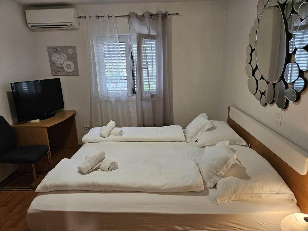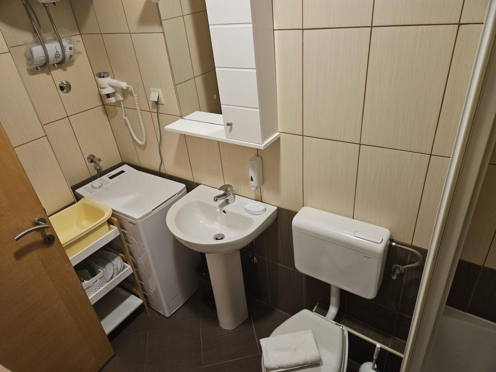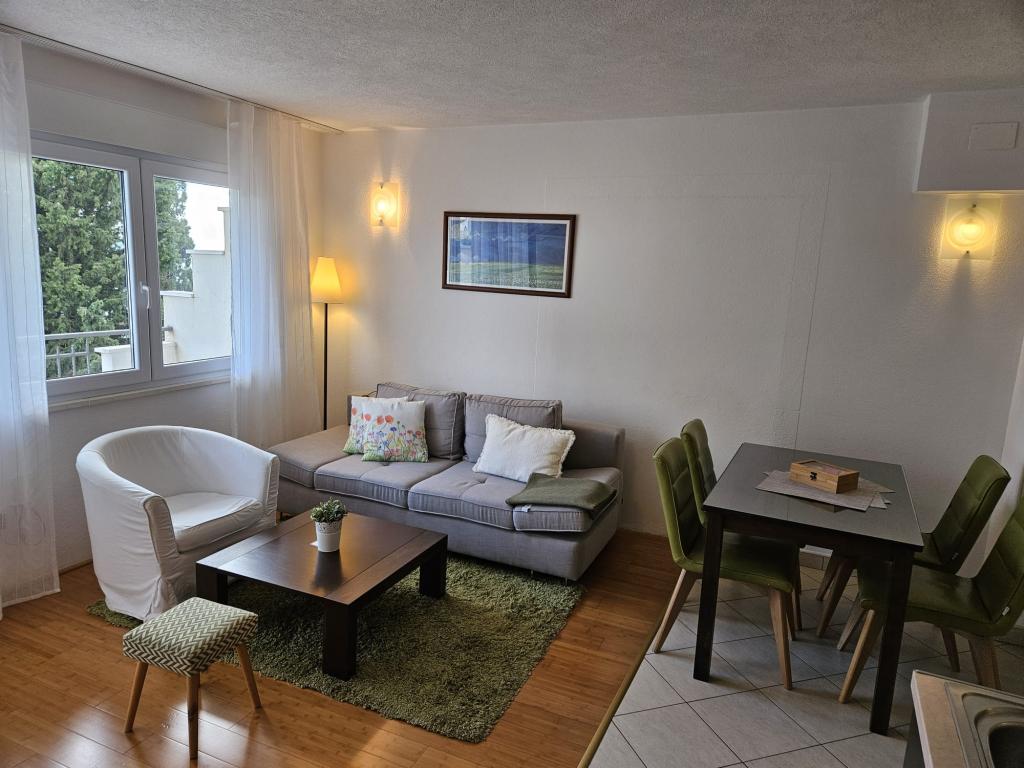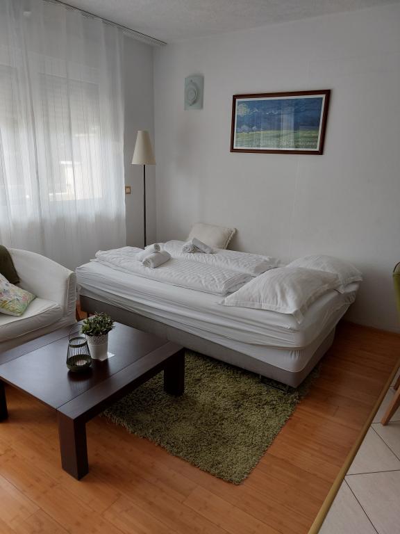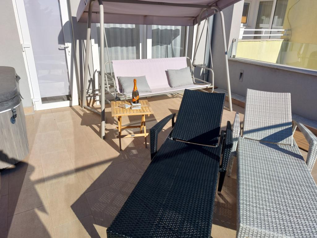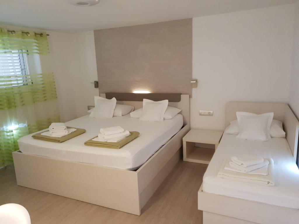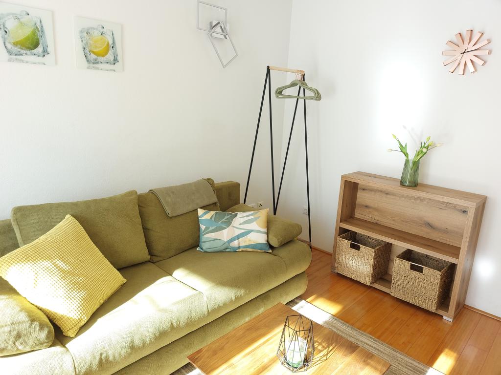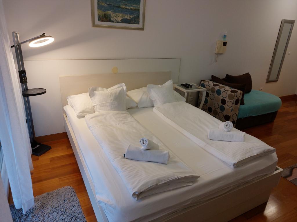 Apartmanjaink modernek és teljesen felszereltek, hogy tartózkodása a lehető legkényelmesebb és leggondtalanabb legyen. Minden apartmanban vasaló és vasalódeszka, hajszárító, filteres kávéfőző, vízforraló és mikrohullámú sütő található. A vendégek rendelkezésére állnak az ételek elkészítéséhez és tálalásához szükséges összes eszköz. Minden szállásegység síkképernyős TV-vel, ingyenes Wi-Fi-vel, beltéri és kültéri ülő- és pihenősarokkal felszerelt. A szállásegységek légkondicionáltak. A parkolást előre kell foglalni a létesítményen belüli korlátozott parkolóhelyek száma miatt. Érkezéskor friss ágynemű és törölközők várják Önt, amelyeket megbeszélés szerint cserélnek. Gyermekágy előzetes bejelentkezés alapján ingyenesen bérelhető. A létesítményen belül egy közös udvar található ülőbútorokkal, mediterrán növényekkel körülvéve - ideális hely a kikapcsolódásra. A létesítmény csendes környéken található, a tengertől a második sorban, mindössze 2 perc sétára a strandtól és tíz perc könnyű sétára a központtól.