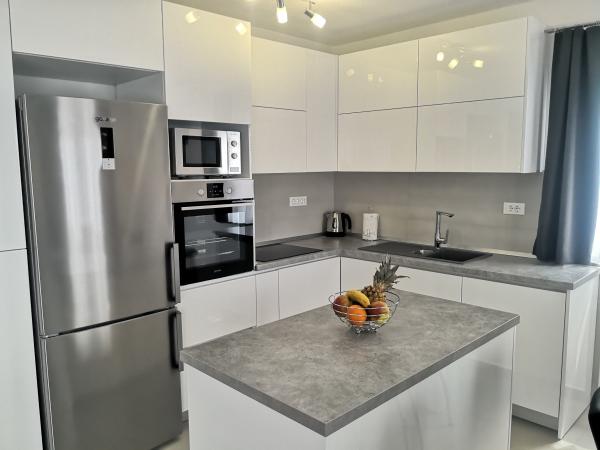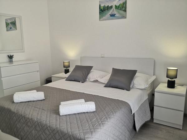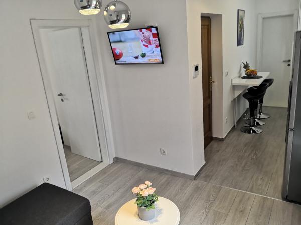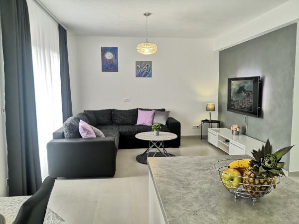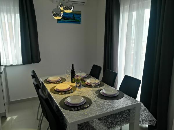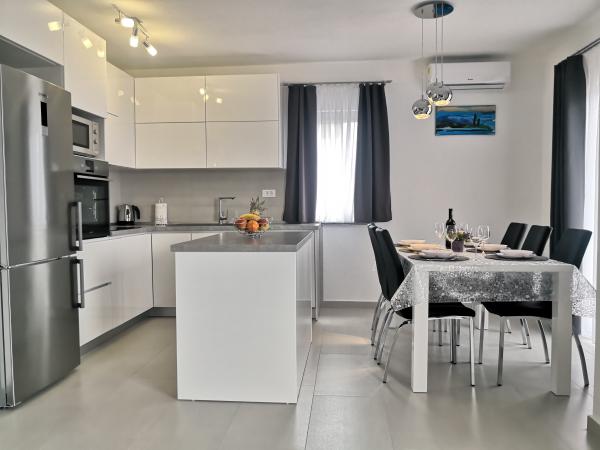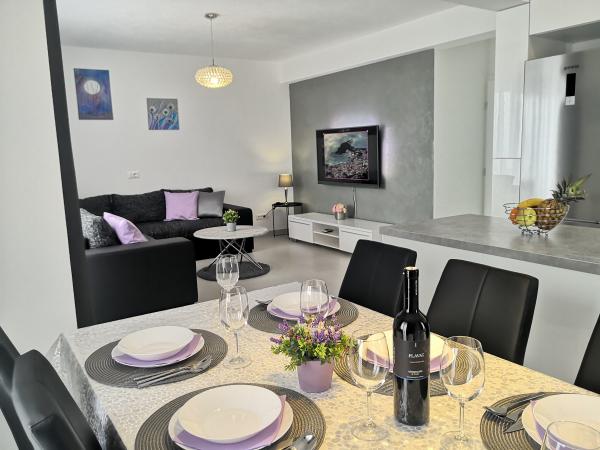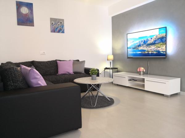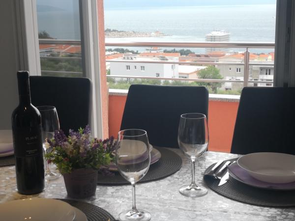 Az újonnan berendezett és fényűzően berendezett apartman Makarska csendes részén található, gyönyörű kilátással a Makarska-ra, a tengerre, a szigetekre és a Biokovo hegységre. Az apartman mindent tartalmaz, amire szüksége van egy pihentető nyaraláshoz. Légkondicionálás, konyha, mosogatógép, mosógép, internet, televízió, parkolóhely és egy szabadtéri grillezés lehetősége az udvarban, és még egy gyönyörűebb kert.