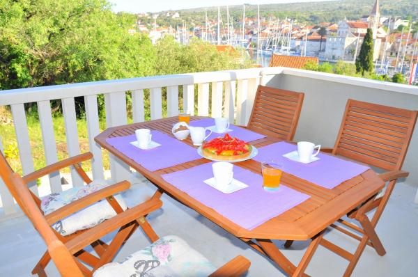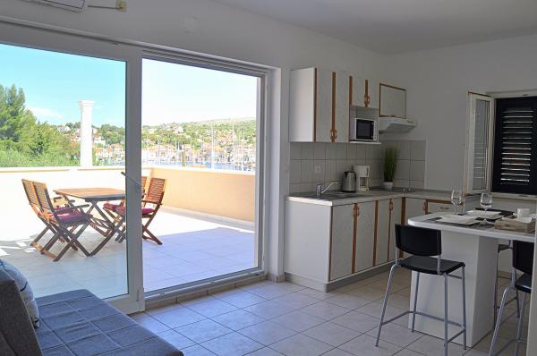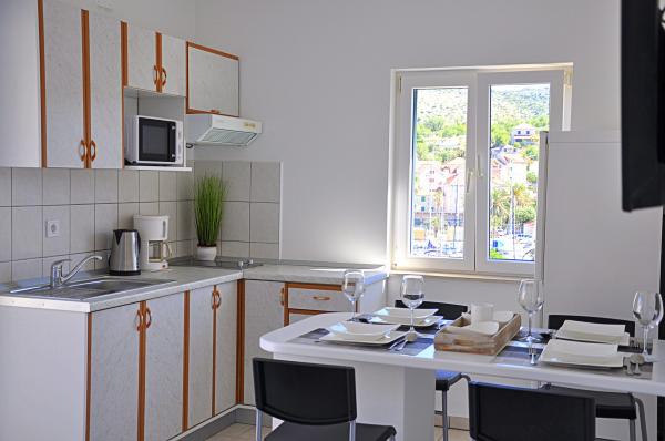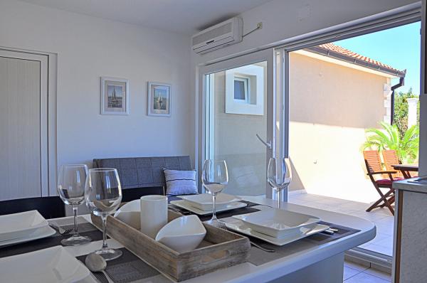 Az apartmanok találhatók egy családi ház, amely egy csendes helyen, és csak 10 percre a központtól és 15-re a strandtól. Kínálunk két apartman. A2 (4 1) 60m2 csillag tartalmaz egy teljesen felszerelt konyha, egy kijárat egy nagy terasz, gyönyörű kilátás nyílik az öbölre. Az apartman két hálószoba, két fürdőszoba, ami hajszárító és ingyenes piperekészlet található. Mosógép, TV, műholdas, internet és grillező. Mi teszi a háziállatok. A1-újonnan berendezett lakás egy 4 csillagos, 80m2, két kétágyas hálószoba TV-vel, két fürdőszoba zuhanyzóval (hajszárítóval és személyes szépség kiegészítők) tágas nappali LCD TV-vel és modern kanapéval, teljesen felszerelt konyha mosogatógéppel és étkezővel. Az egész lakás légkondicionált és padlófűtéssel, műholdas TV-vel és Wi-Fi internet. Ez is egy tágas teraszáról panorámás kilátás nyílik az öbölre és ingyenes parkolási lehetőséget és grill