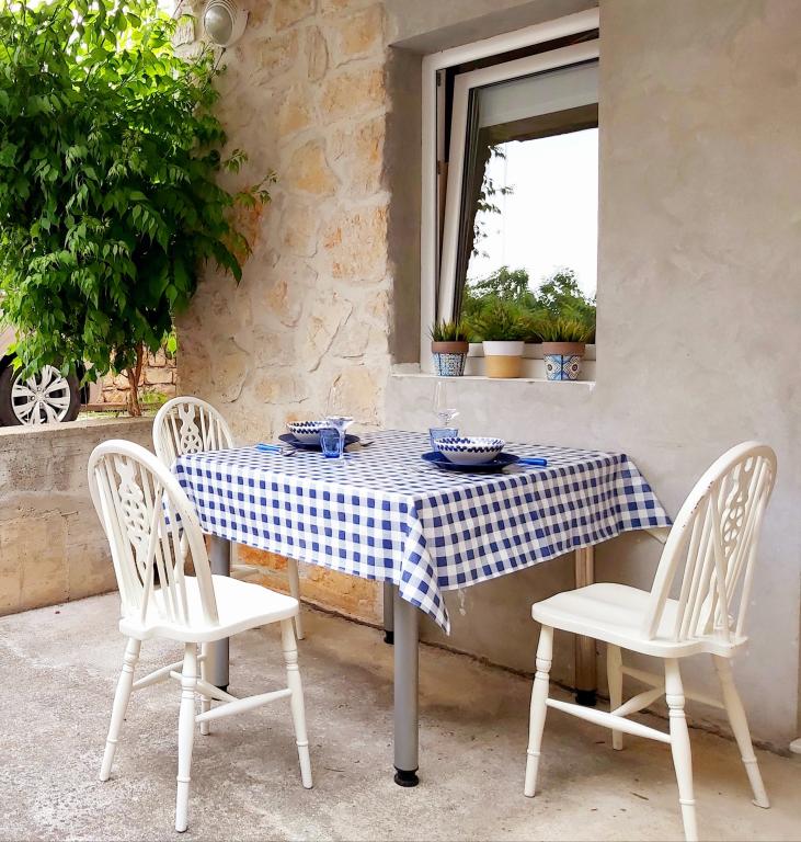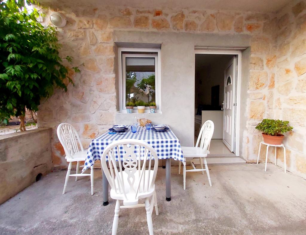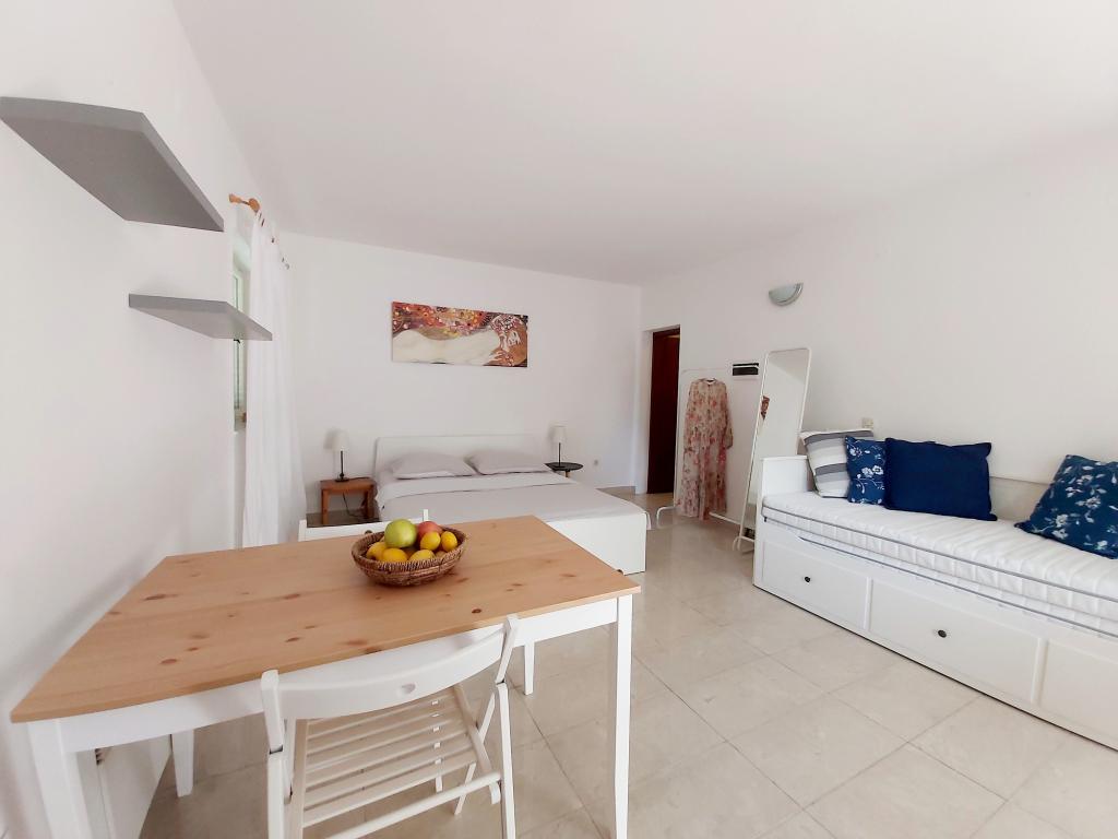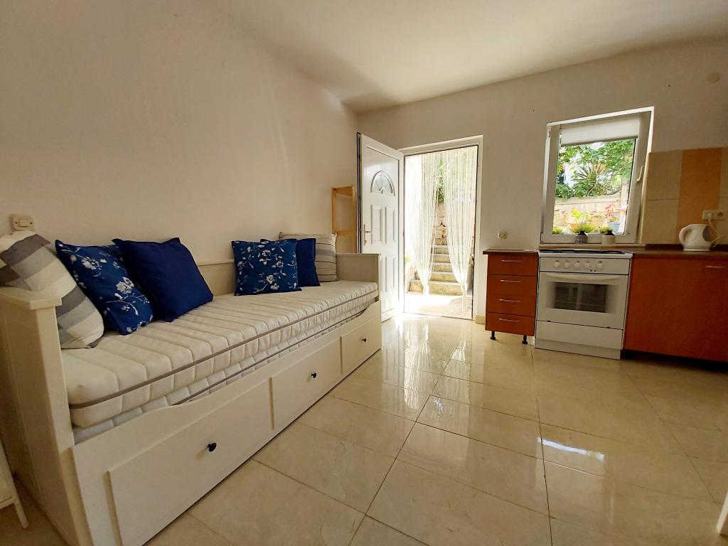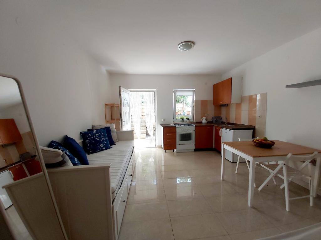 Stúdióapartman 12 m2-es terasszal. Az apartman 2 fő részére készült. Nagy franciaágy, teljesen felszerelt konyha, étkezőasztal, fürdőszoba. Terasz és étkezőasztal. Biztonságos parkolóhely az apartman előtt egy autó számára. Közel a strandhoz. Az apartman 5 perc sétára található a Slanica strandtól és 7 perc sétára Murter központjától.