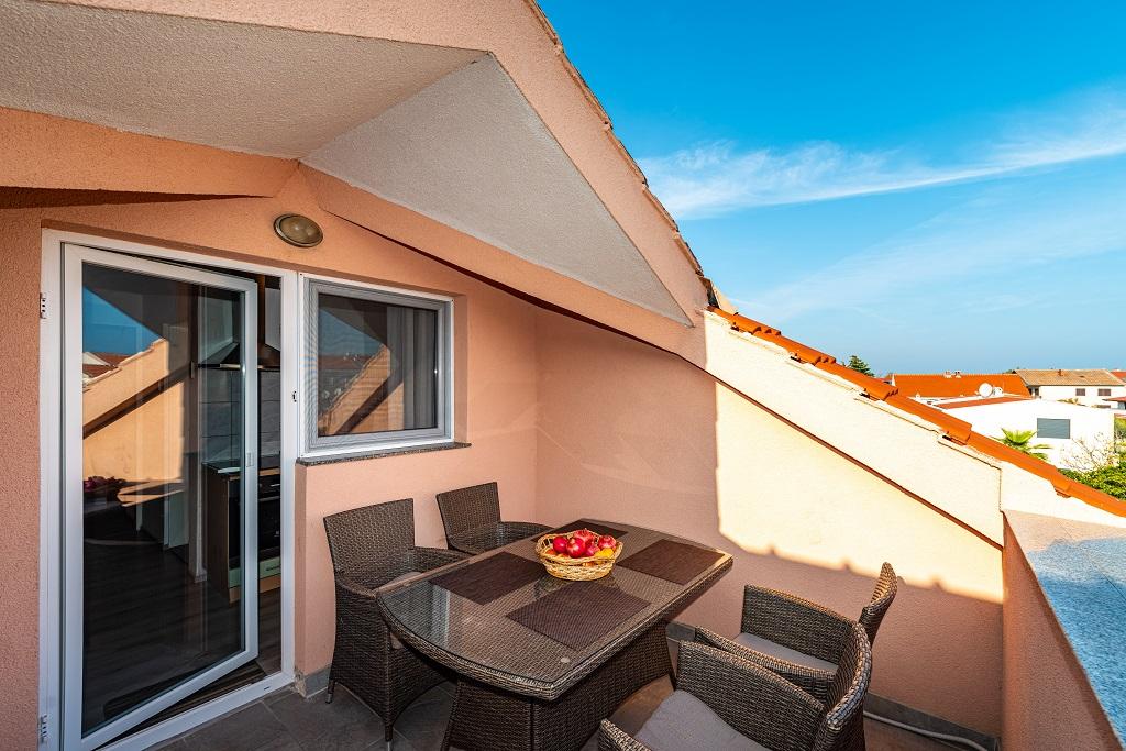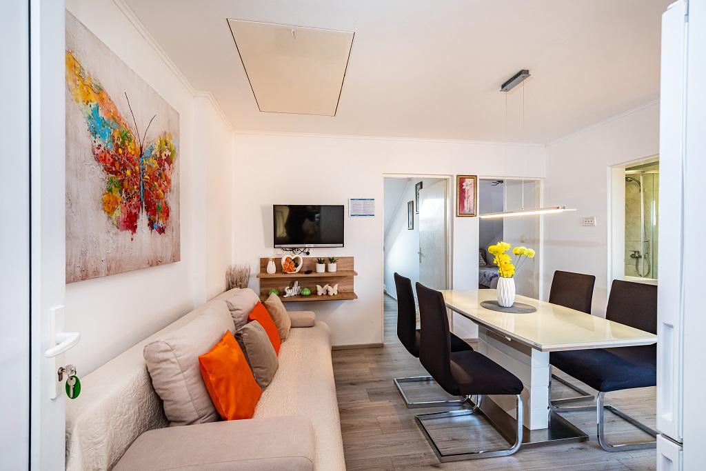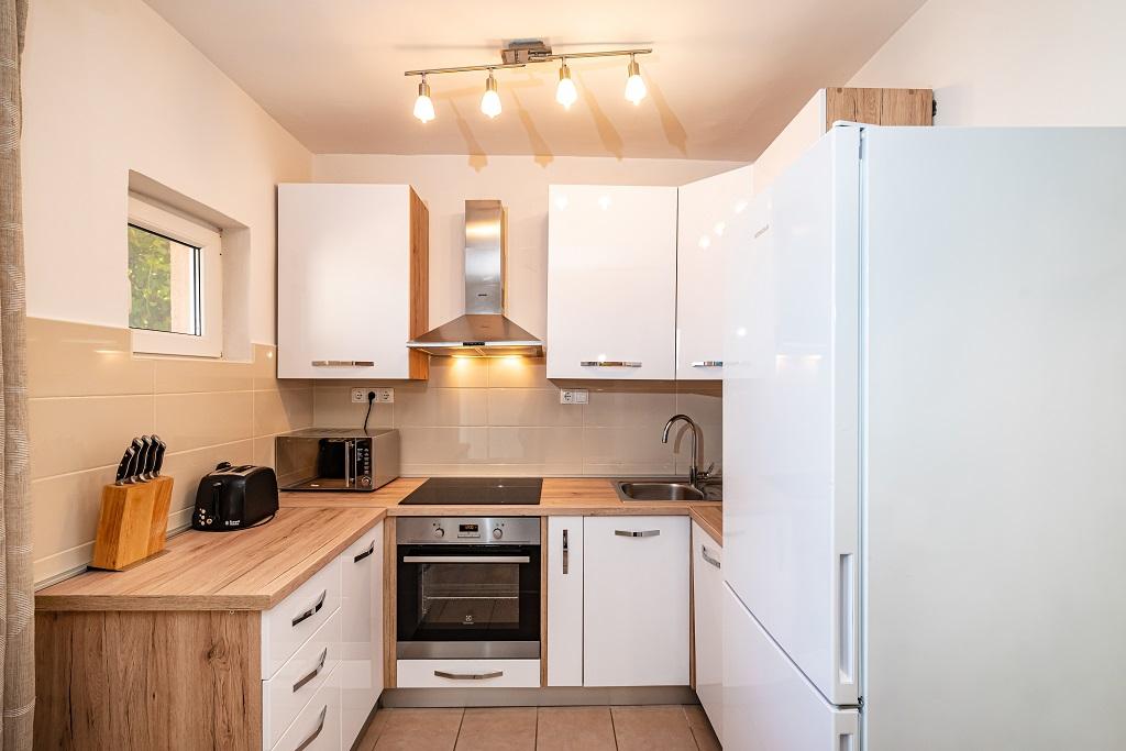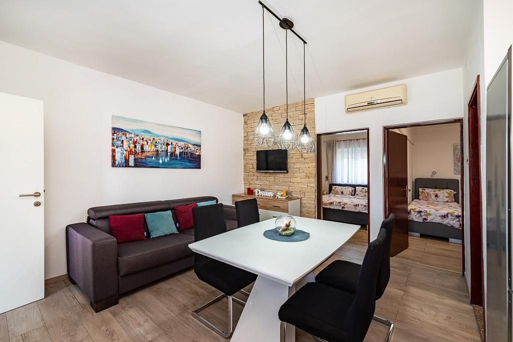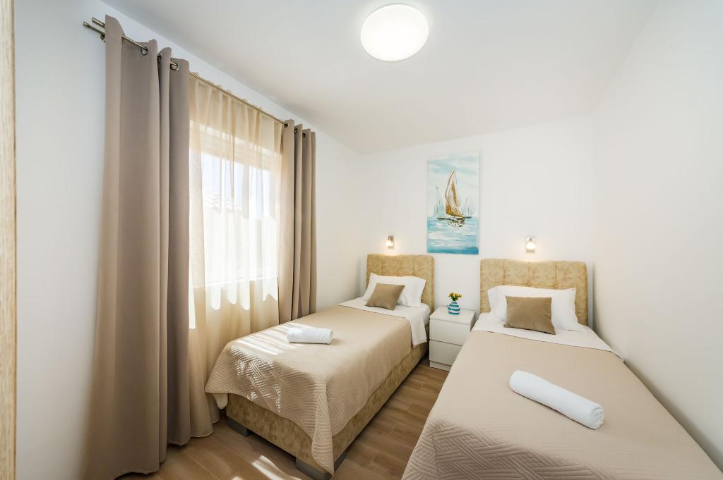 Modern apartmanjaink Ninben, a Nin-öböl déli részén, a Ždrijac-félszigeten fekvő tengerparti városban találhatók, Zadartól 17 km-re északra. Horvátország legrégebbi királyi városa, a híres Ždrijac homokos strand közelében. Nin nemcsak történelmi város. Környezetével együtt kedvező feltételeket biztosít a pihenéshez és a kikapcsolódáshoz. Nin környékén számos hosszú homokos lagúna található homokos strandokkal, távol a tömegtől, valamint egy ipari övezet, kiváló mikroklímával. Az apartmanok egy gyönyörű és nagyon csendes környéken találhatók, kevesebb mint öt perc sétára a strandtól és az Adriai-tengertől. A ház kétszintes. A tulajdonosok a földszinten laknak, két apartman az első emeleten és kettő a másodikon. A ház különálló, és a telek kerített, így nagyon alkalmas gyermekek számára. Öt autó számára parkoló és grillező is található a kertben. Az apartmanok kerekesszékkel nem alkalmasak. Vezeték nélküli internet áll rendelkezésre. A strand és a tenger mindössze 100 méterre található az apartmanoktól, egyéb létesítmények pedig 600 méterre.