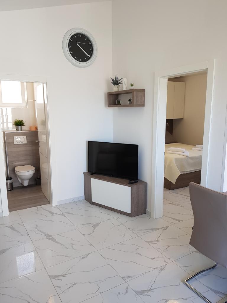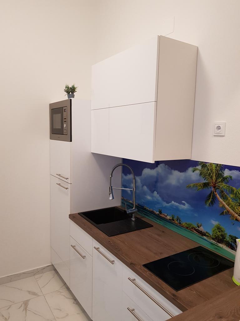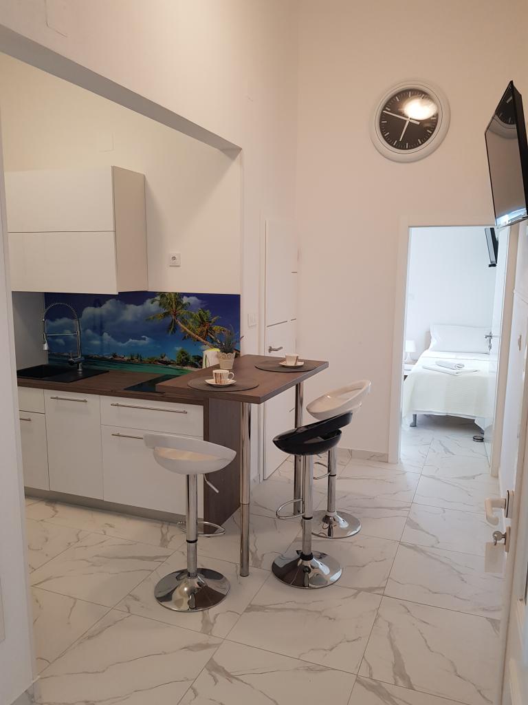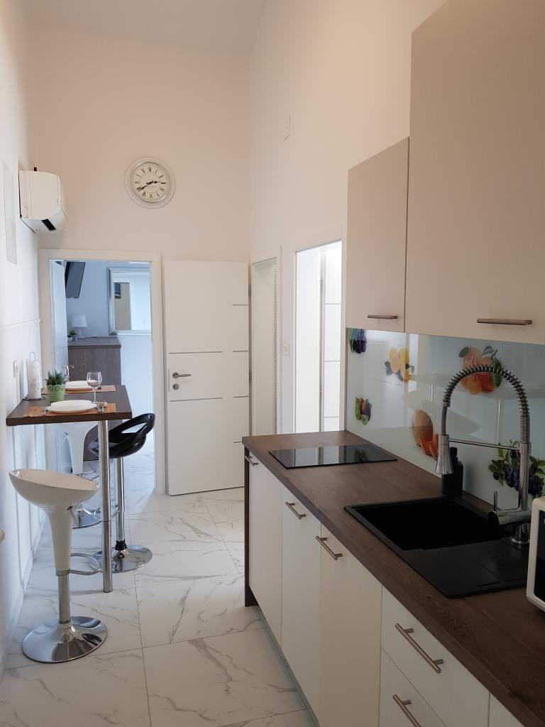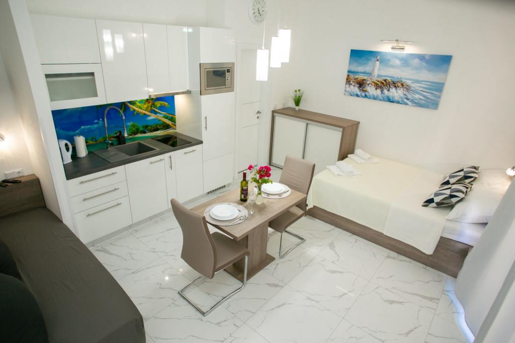 Modern felszereltségű apartmanok teljesen felszerelt konyhával, vízforralóval, kenyérpirítóval, mikrohullámú sütővel, kávéfőzővel, vasalóval, széffel és hajszárítóval.