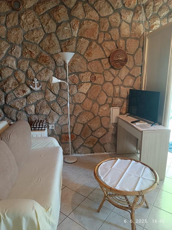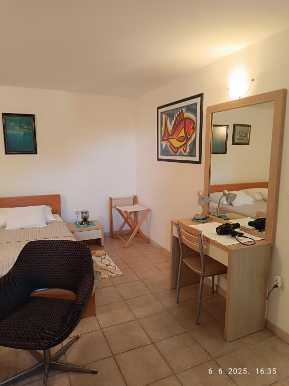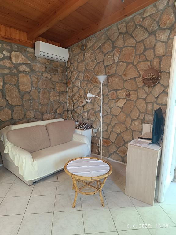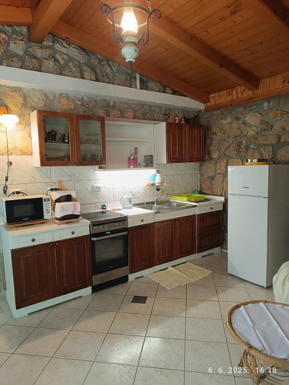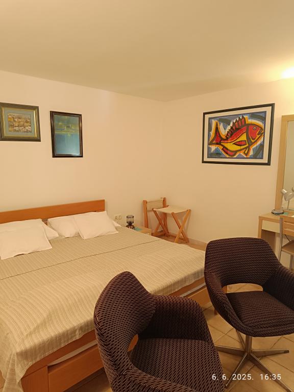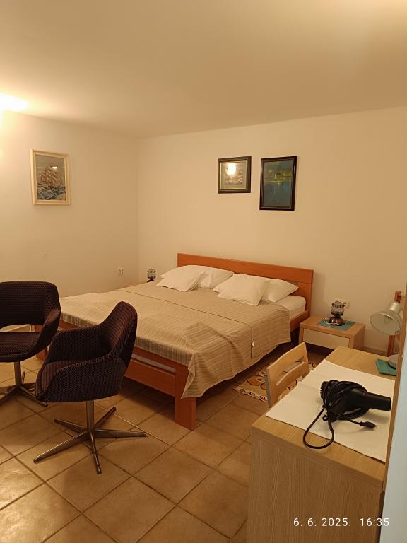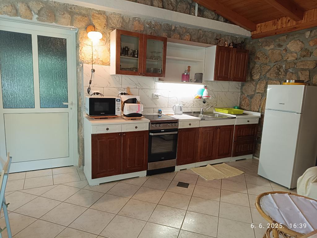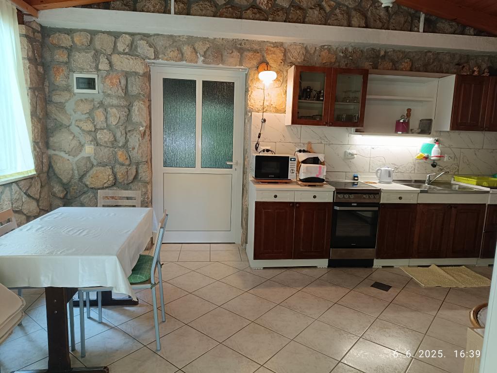 Két nagyobb kétszobás apartman (60 m2) található a ház 2. emeletén, gyönyörű kilátással a tengerre, és egy kisebb egyszobás apartman (45 m2) egy különálló kő (rusztikus) házban található a mellett. a főház, amellyel közös a kert és az udvar. Ingyenes parkolás biztosított. A kertben teraszos grillsütő minden vendég rendelkezésére áll. A tengertől való távolság kb. 250 m-re lefelé, ahol van egy sétány éttermekkel és különböző típusú strandokkal. A központ távolsága körülbelül 1,5 km, a tengerparti sétány mentén.