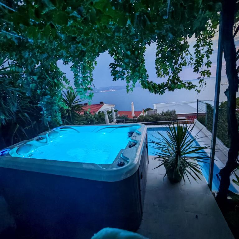 modern apartman egy csendes területén Omis mediterrán növényzet veszi körül, kilátással a tengerre.