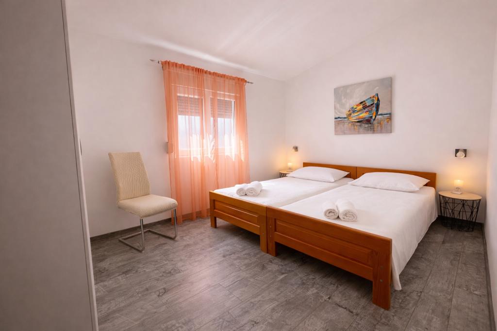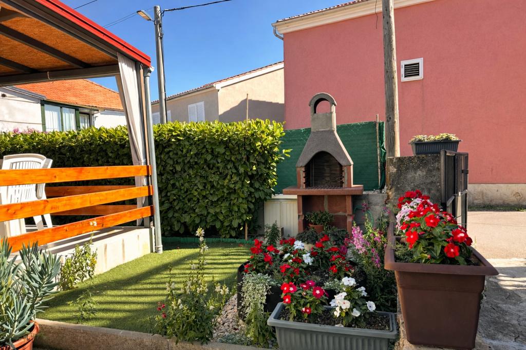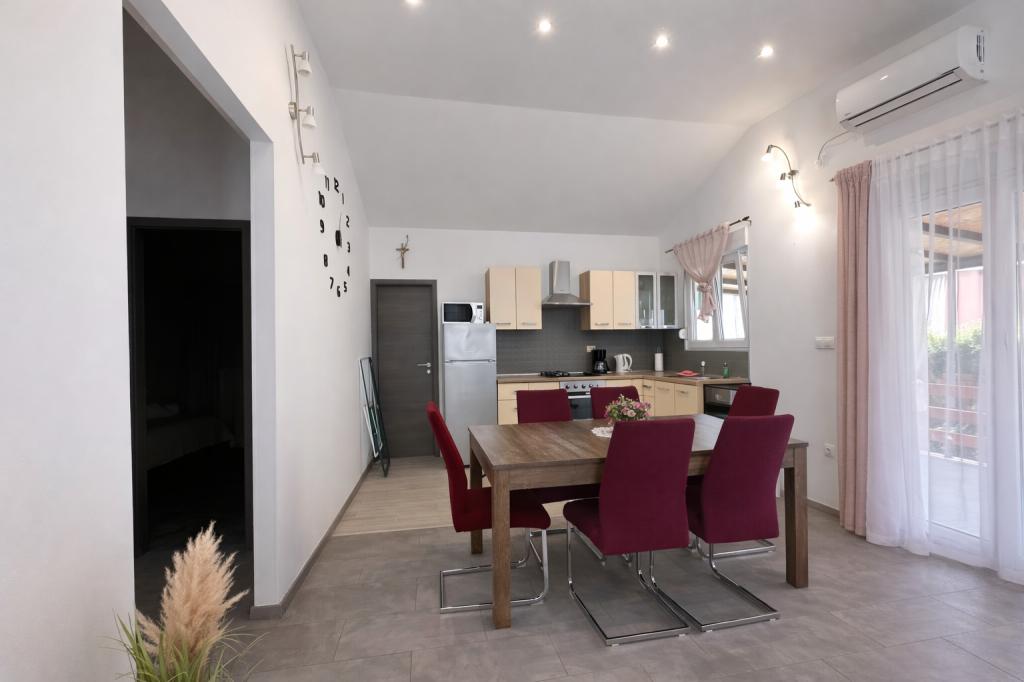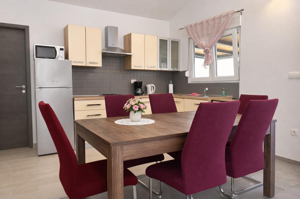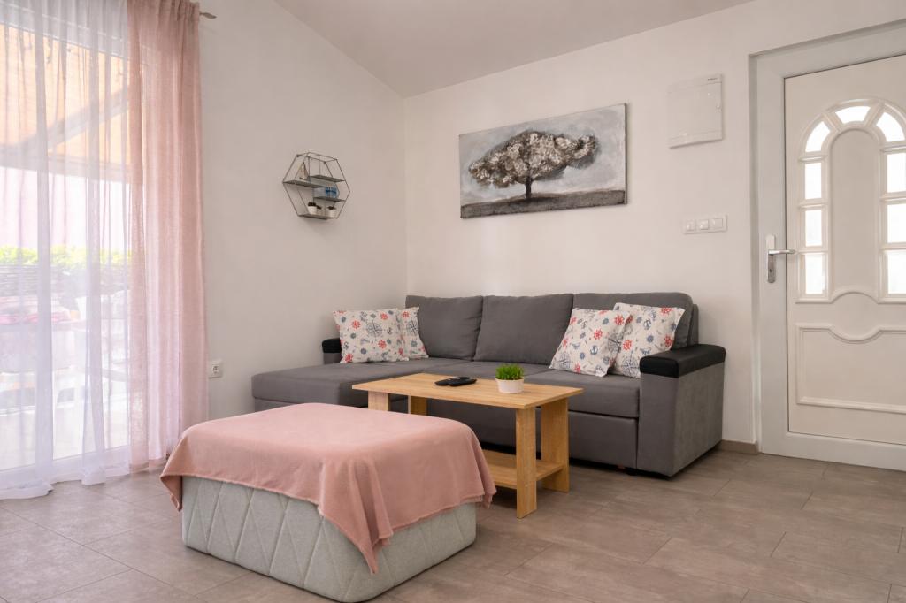 A szálláshely maximum 5 vendég elszállásolására alkalmas, két hálószobával rendelkezik franciaággyal (160x200), valamint egy pótággyal egy 12 éves korig terjedő gyermek számára a nappaliban. A vendégek rendelkezésére áll ágynemű és törölköző, zuhanyzós fürdőszoba mosógéppel, hangulatos nappali TV-vel és teljesen felszerelt konyha (hűtőszekrény, tűzhely, sütő, mosogatógép, vízforraló és edények). A fedett terasz ideális reggeli kávézáshoz vagy pihenéshez, a vendégeknek pedig saját parkolóhely áll rendelkezésükre. Az udvar kerített. A szálláshely 800-900 méterre található a legközelebbi strandtól, míg a bolt és a pékség mindössze 100 méterre található. A szálláshely könnyen megközelíthető a Pakoštane közelében lévő autópálya-kijárattól, körülbelül 15 perces autóútra. Üdvözöljük! :) Kérjük, minden kérdés esetén használja a kapcsolatfelvételi űrlapot! KÖSZÖNJÜK :) A 2026-os szezonra vonatkozó árlista frissült!