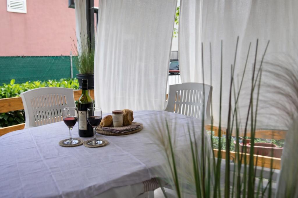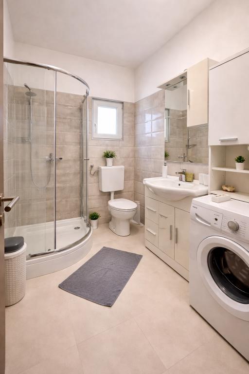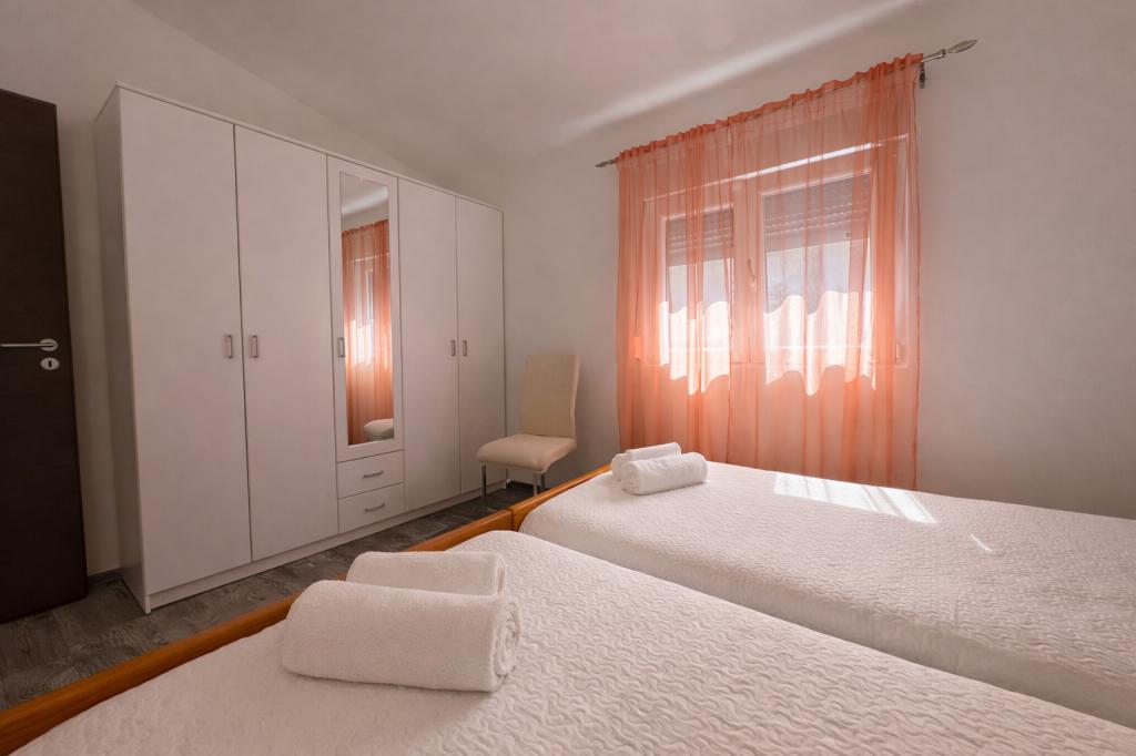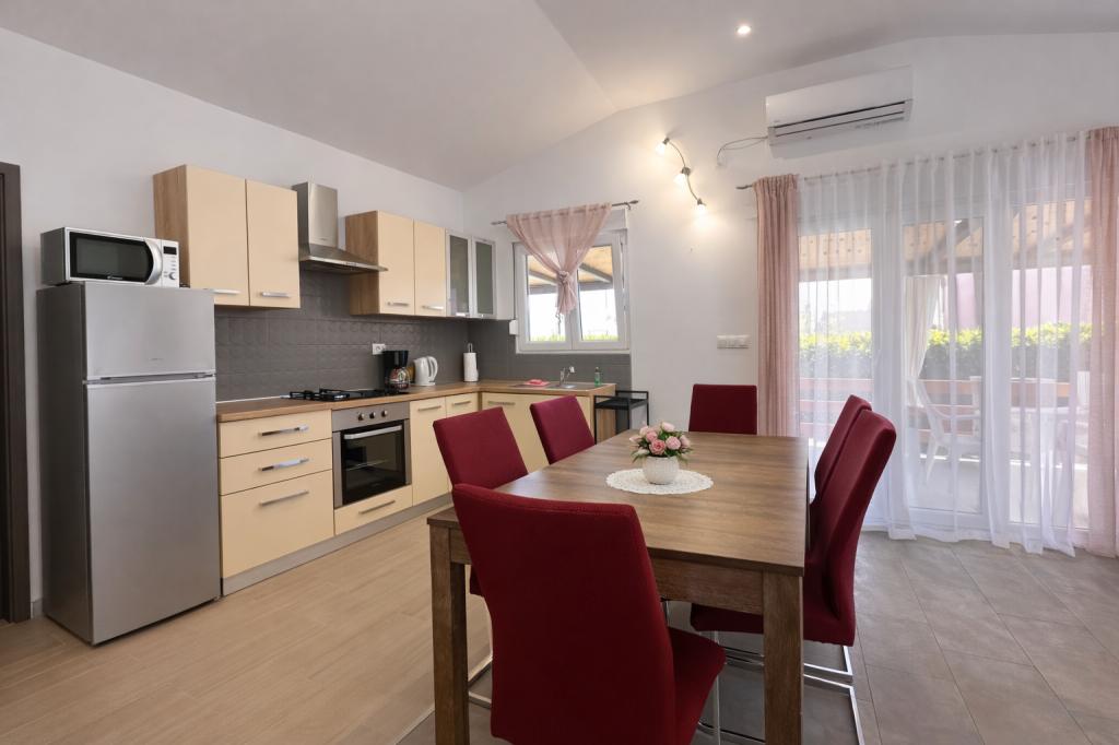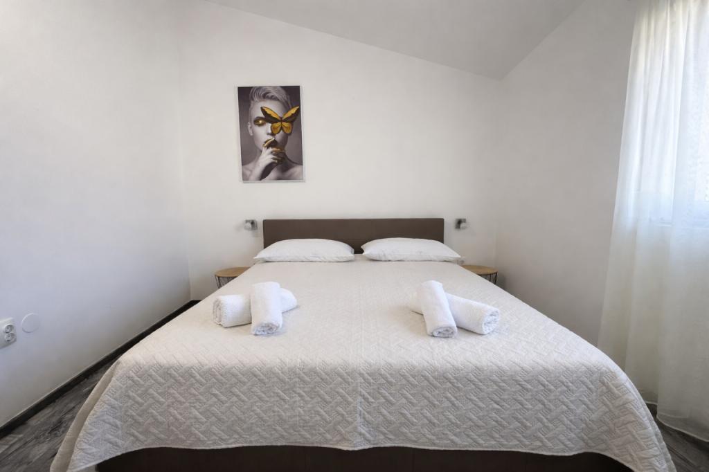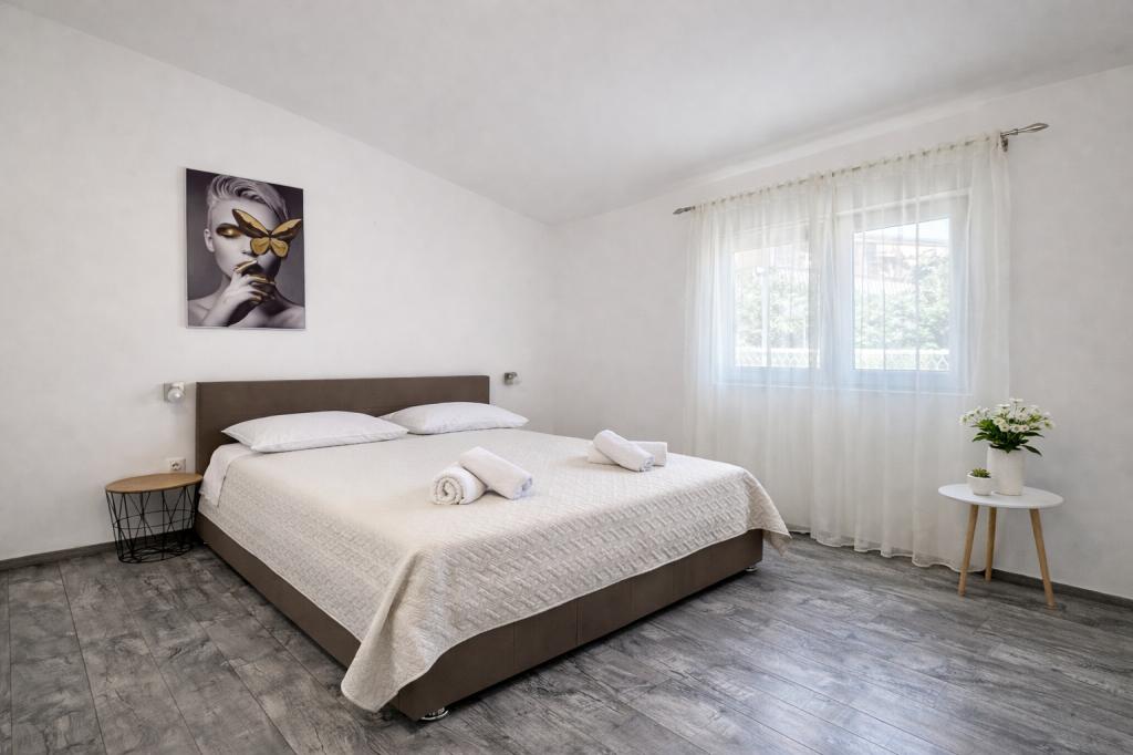 A szálláshely maximum 5 vendég elszállásolására alkalmas, két hálószobával rendelkezik franciaággyal (160x200), valamint egy pótággyal egy 12 éves korig terjedő gyermek számára a nappaliban. A vendégek rendelkezésére áll ágynemű és törölköző, zuhanyzós fürdőszoba mosógéppel, hangulatos nappali TV-vel és teljesen felszerelt konyha (hűtőszekrény, tűzhely, sütő, mosogatógép, vízforraló és edények). A fedett terasz ideális reggeli kávézáshoz vagy pihenéshez, a vendégeknek pedig saját parkolóhely áll rendelkezésükre. Az udvar kerített. A szálláshely 800-900 méterre található a legközelebbi strandtól, míg a bolt és a pékség mindössze 100 méterre található. A szálláshely könnyen megközelíthető a Pakoštane közelében lévő autópálya-kijárattól, körülbelül 15 perces autóútra. Üdvözöljük! :) Kérjük, minden kérdés esetén használja a kapcsolatfelvételi űrlapot! KÖSZÖNJÜK :) A 2026-os szezonra vonatkozó árlista frissült!