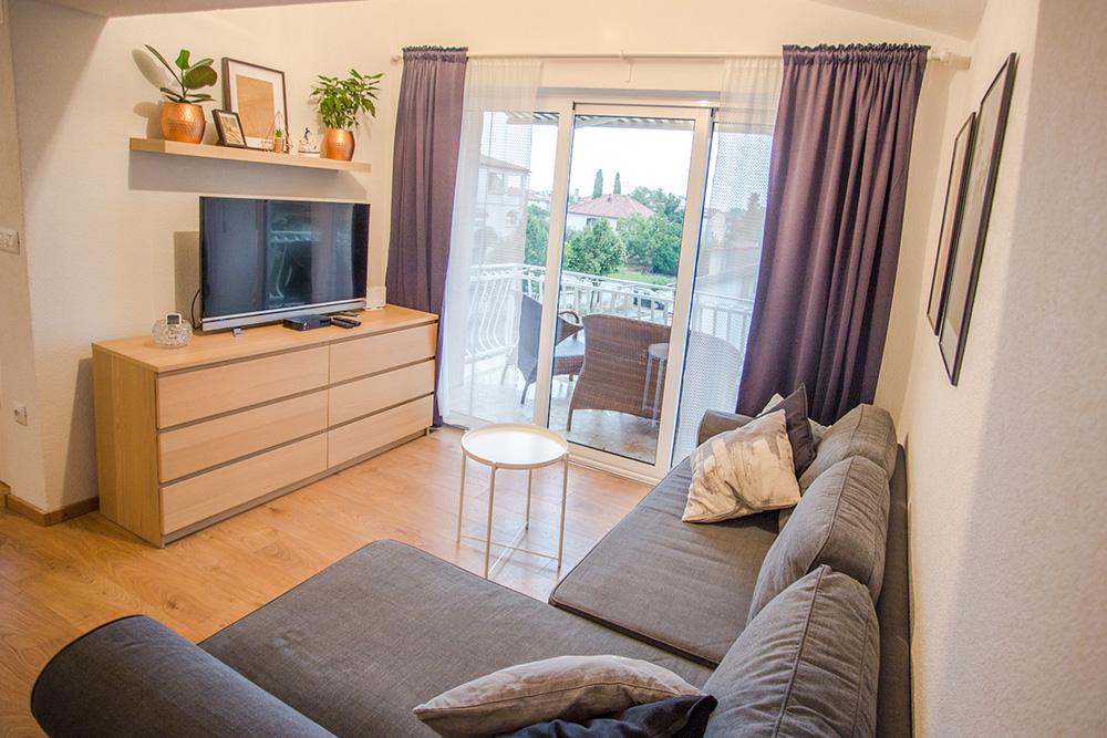 A lakás a Pakostane bejáratánál található, a ház második emeletén. Három szoba két fürdőszobával és terasszal rendelkezik. A strand és a központ 10 perces sétával elérhető.