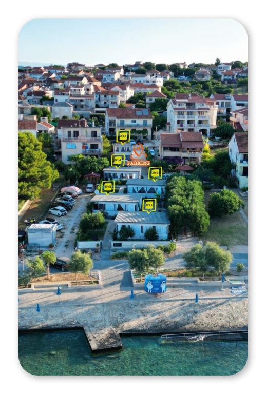 Mobilházak Pakoštane központjában, közvetlenül a fő homokos strand mellett, közvetlen tengerre néző kilátással. A mobilházban két hálószoba, étkező, konyha, WC és egy nagy terasz (5) található. Minden vendég rendelkezésére áll egy grillező. A vendégek számára parkolóhely biztosított. Háziállatok megengedettek, de 7 euró/éj/háziállat felár ellenében. Saját csónakkikötővel és utánfutó-parkolóval rendelkezünk, amelyek felár ellenében állnak a vendégek rendelkezésére.