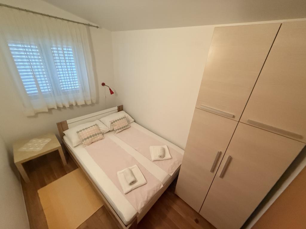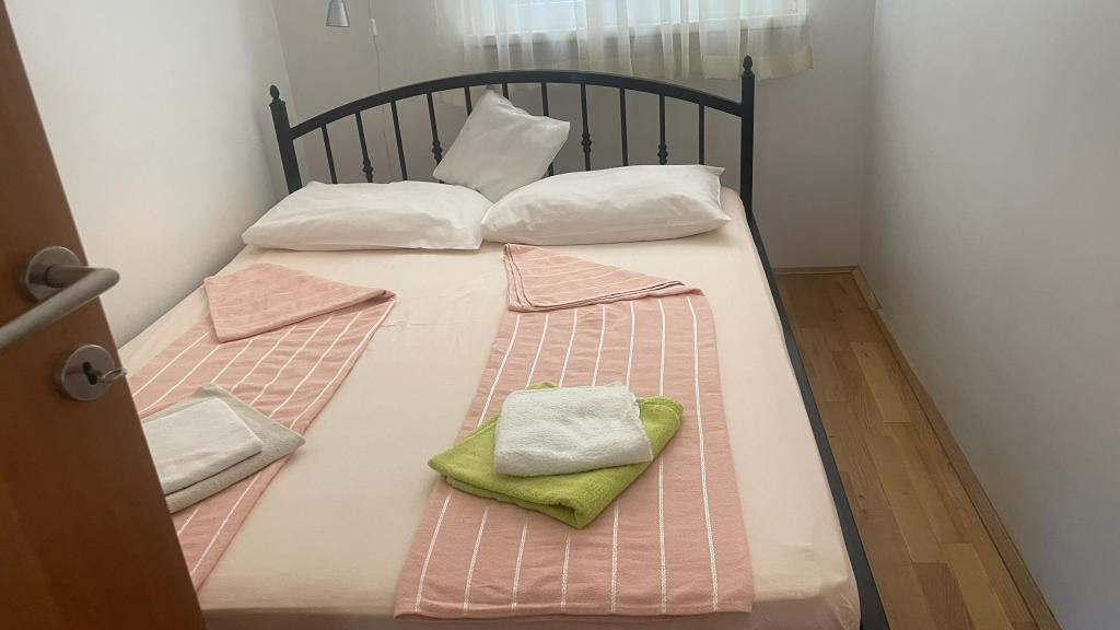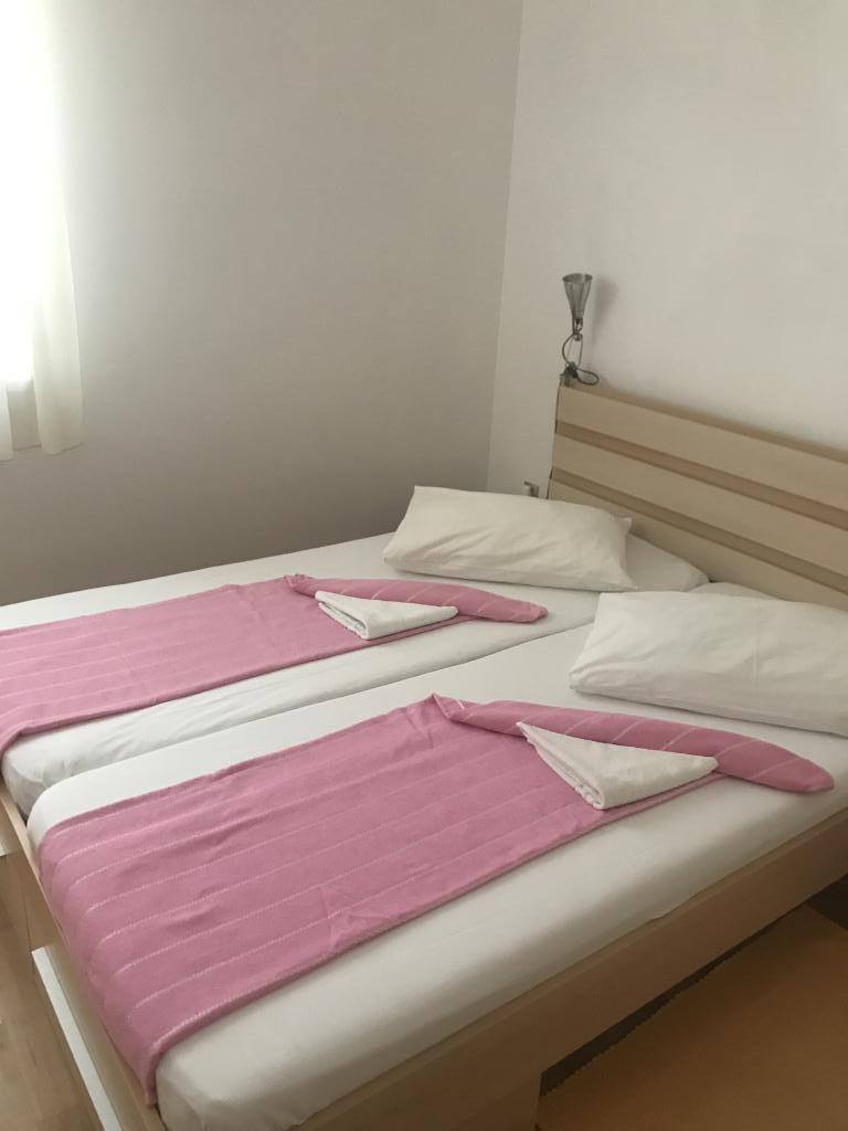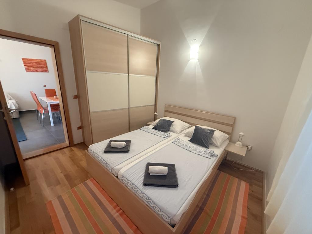 Családi nyaraláshoz ideális apartmanok Három, szinte teljesen azonos apartmant kínálunk, amelyek mindegyike kényelmes családi nyaraláshoz van kialakítva. Minden apartman a következőkből áll: Nappali étkezővel és konyhával Két hálószoba: szülői (160x200) és gyerek (140x200) Nappali kanapéval. A konyha indukciós főzőlappal ellátott standard sütővel, kis hűtőszekrénnyel, vízforralóval és filteres kávéfőzővel, valamint minden szükséges edénysel felszerelt. A fürdőszobában zuhanykabin található, kicsi, de funkcionális. Minden apartmanhoz tartozik egy csendes sarok eltolható fallal ellátott loggia formájában. Minden ablakon szúnyogháló található. Vendégeink számára kültéri grillező is rendelkezésre áll asztallal és székekkel, hogy élvezhessék a szabadban tartózkodást. Higiéniai színvonalunk nagyon magas, ami különösen fontos számunkra. Az ár tartalmazza: Légkondicionálás Idegenforgalmi adó Műholdas TV (nincs Smart TV-nk) Teljes edények és ágynemű Egy törölköző vendégenként Háziállatok előzetes egyeztetés alapján és kedvezményes áron engedélyezettek.