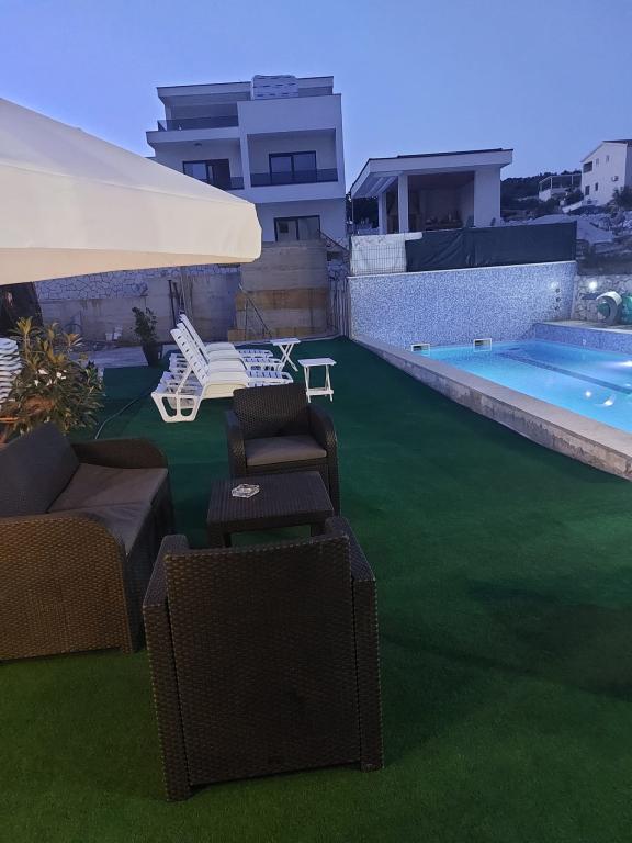 Apartmanok Dinko Sevid (Apartmanok fűtött medencével) 7 apartmanból, 3 kétszobás apartmanból és 4 egyszobás apartmanból és egy kattintható ággyal a konyhában áll. Minden apartman gyönyörű kilátással a tengerre, légkondicionálóval és wifivel rendelkezik. Az Apartments Dinko 100 méterre található a strandtól, vendégeinknek 3 kajakot és 3 supot kínálunk ingyenesen. A fűtött medencében és két szabadtéri grillben is úszhatnak a vendégek. Sevid elvarázsol kristálytiszta tengerével és érintetlen természetével. Sevid egy kis turistaváros (45 km-re Splittől és Šibeniktől, 20 km-re Trogirtól (UNESCO védelem alatt álló város), 19 km-re Primoštentől, 12 km-re Rogoznicától, 55 km-re a Krka Nemzeti Parktól). Az Apartments Dinko kiváló választás mindazok számára, akik csendes nyaralásra vágynak távol a város zajától és tömegétől. A barátságos házigazdák még kellemesebbé és szebbé teszik az itt-tartózkodást.