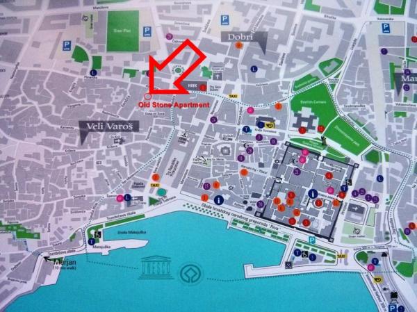 Old Stone House található a Split szívében, a város része úgynevezett Varos Vela. Város tele van régi kőházak virágokkal díszített kis szűk utcák (utcák) jellemző Dalmácia. Az apartman található, 650 m-re Diklecijanove palota, 400 méterre a vízparttól. A kényelmes, 15 perces sétával eljut a Marjan-hegy, amelynek partján lehet úszni, és pihenjen a fenyőfák árnyékában. A homokos strand Bačvice, található, körülbelül 1300 méterre a háztól (15 perc séta). Nagyon közel vannak peškarija (piac friss hal) és a piac (piac friss gyümölcsök és zöldségek). Az apartman található, három emeleten. A földszinten van az udvaron grillezési, amely csak azok számára, akik jelenleg is használja a lakást. Az első emeleten van egy terasz, két hálószoba és egy fürdőszoba. A második emeleten található a nappali, konyha és étkező. A konyhában hűtőszekrény, sütő, mikrohullámú sütő, vízforraló, törölköző, szalvéták ... a fürdőszobában van szappan, sampon, hálózati adapter, haj, higiénia táskák ...