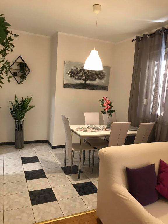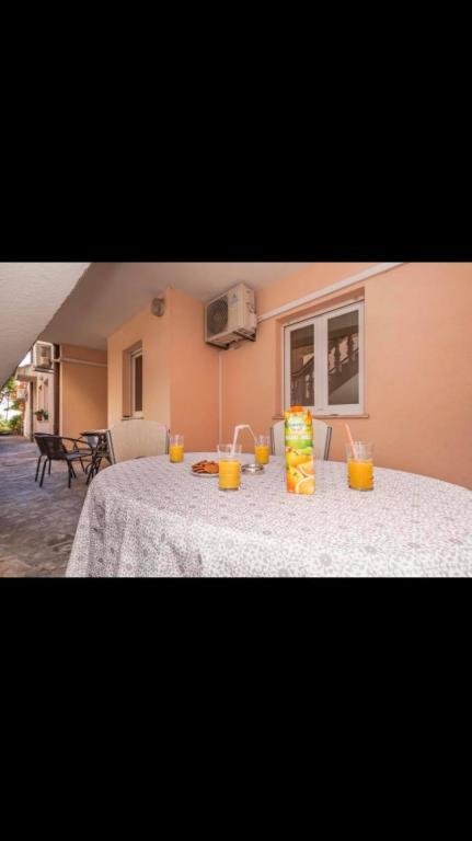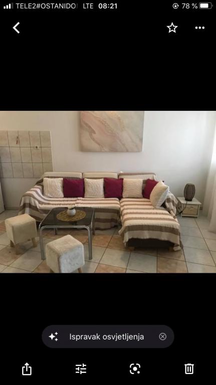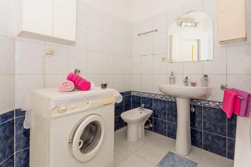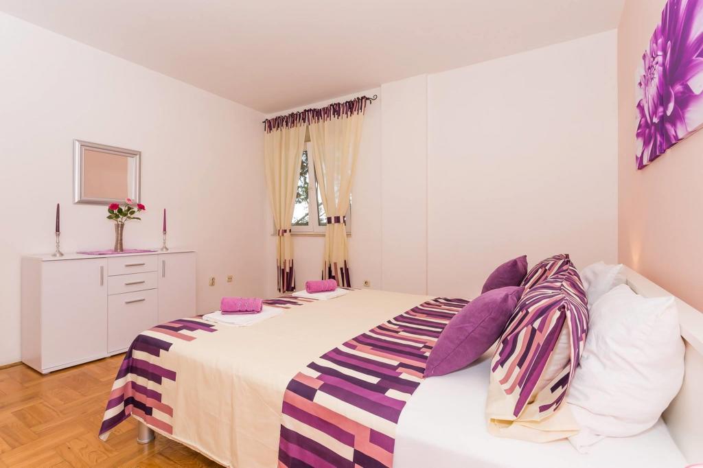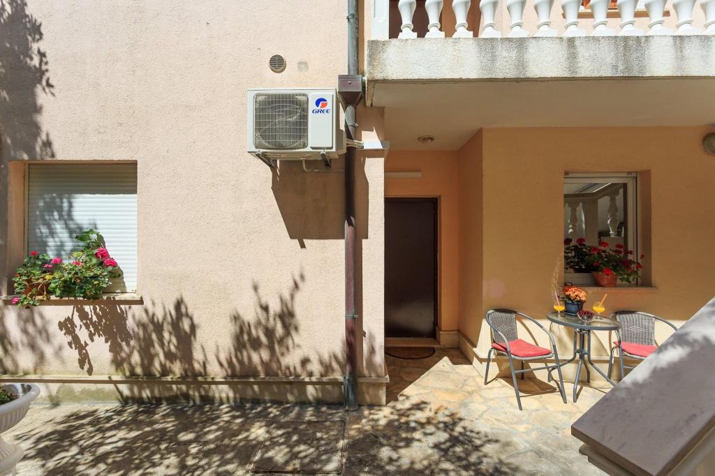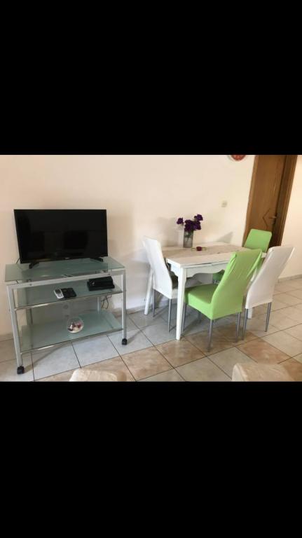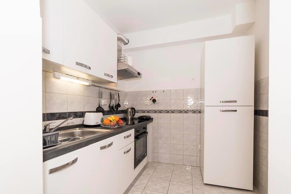 A lakás az első sorban található a tenger felé egy új épületben. Az apartman két nagy hálószobával rendelkezik dupla ággyal, két WC-vel, konyhával, étkezővel, nappalival és terasszal. Az apartman 200 méterre az első kavicsos strandtól és 300 méterre a homokos strandtól. Az első kávézótól és éttermetől kevesebb, mint 100 méter, a Renato kávézó, a Tennis bár és a Mythos, a Velo Misto és a Barkarola étterem. A távolság a városközponttól gyalog körülbelül 20 perc. 100 méter távolságra teniszpályák vannak bérelhetők.