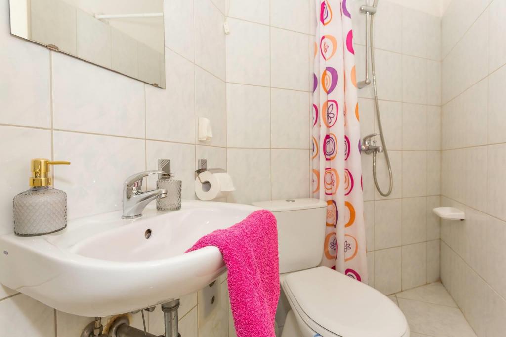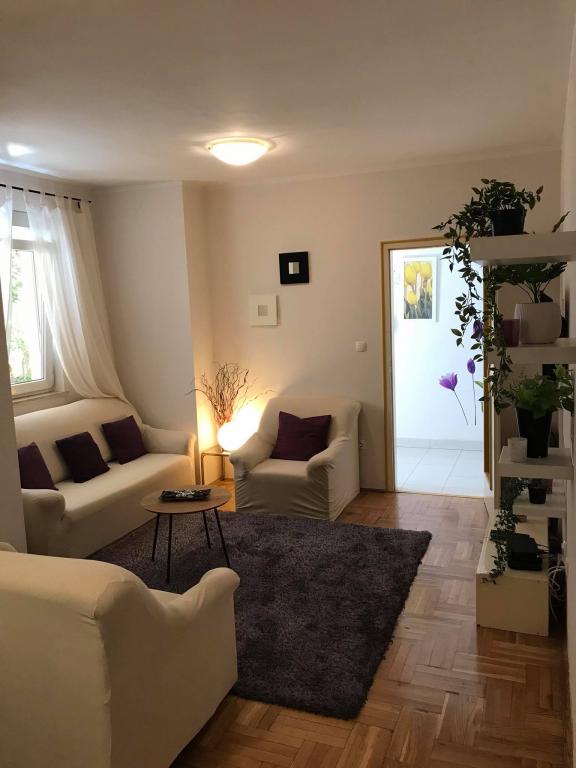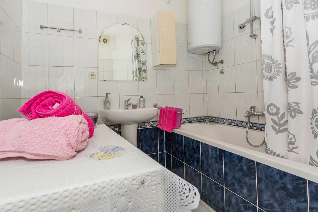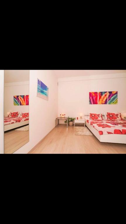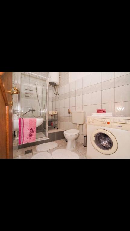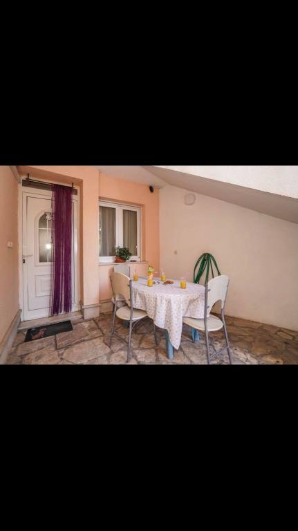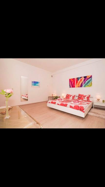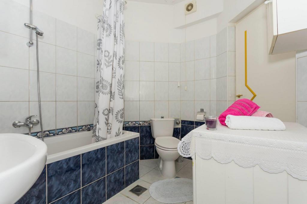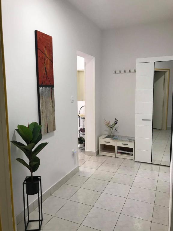A lakás az első sorban található a tenger felé egy új épületben. Az apartman két nagy hálószobával rendelkezik dupla ággyal, két WC-vel, konyhával, étkezővel, nappalival és terasszal. Az apartman 200 méterre az első kavicsos strandtól és 300 méterre a homokos strandtól. Az első kávézótól és éttermetől kevesebb, mint 100 méter, a Renato kávézó, a Tennis bár és a Mythos, a Velo Misto és a Barkarola étterem. A távolság a városközponttól gyalog körülbelül 20 perc. 100 méter távolságra teniszpályák vannak bérelhetők.