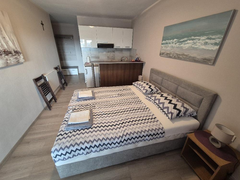 Bérelünk egy bájos kétágyas apartmant Tribunjban, egy festői halászfaluban, amely a part mentén emelkedik, nem messze a festői Vodice városától, és ismert a hagyományos teherfuvarozási versenyéről. Egy kisebb épület második emeletén található ez az apartman tágas terasszal, ahonnan gyönyörű kilátás nyílik a tengerre és a környező tájra, amely egészen Vodicéig, Šibenikig, Prvićig és számos más szigetig, míg a templom Utca. Nikole éjszaka ragyog a távolban. A vendégek igénybe vehetik a légkondicionálást, a parkolót és a modern LCD TV-t/műholdas antennát a kellemes esti pihenéshez. A konyha teljesen felszerelt, gáztűzhellyel, hűtőszekrénnyel fagyasztóval és minden szükséges kellékkel az ételek, italok elkészítéséhez, felszolgálásához. A fürdőszoba kényelmes, zuhanykabinnal és funkcionális szaniterrel felszerelt. Az ár tartalmazza az idegenforgalmi adót, a légkondicionálás és a parkoló használatát, valamint az ár 30%-os előlegje biztosítja a foglalást. Tribunj gyönyörű strandokat és minden szükséges kényelmi szolgáltatást kínál a kellemes tartózkodáshoz - üzletek, ATM-ek, klinika, gyógyszertár,
