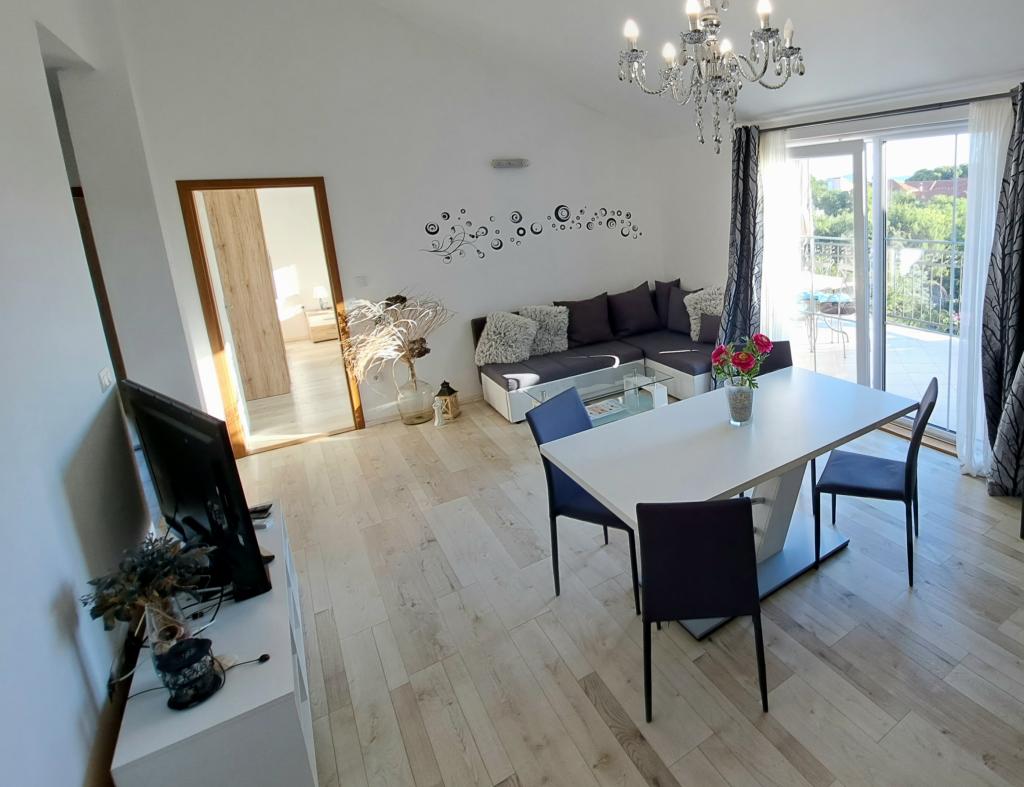 Az "OAZA MIRA" apartmanok egy magán, családi házban találhatók, 3 apartmannal, 4-18 fő befogadására alkalmasak. Zöld növényzet és virágok veszik körül, pihentető a szemnek és a fülnek. Itt madarak csicseregnek és ébresztőnek adják majd. Az általunk kínált apartmanok 65 m²-esek, kettő kétszintes (galériás, egy kb. 20 m²-es hálószobával). Minden apartmanban két hálószoba, étkező, teljesen felszerelt konyha található, ahol mindent megtalál, amire szüksége van (mikrohullámú sütő, kenyérpirító, sütő, kávéfőző, mosógép), valamint nagy fürdőszoba. Az apartmanok tágasak és légkondicionáltak. Ingyenes internet (wi-fi), műholdas TV áll rendelkezésre. Minden apartmanhoz terasz vagy erkély tartozik, ahonnan kilátás nyílik a tengerre, a kertre és a hegyekre. Ingyenes privát parkolás áll rendelkezésre az épületen belül, és foglalás nem szükséges.