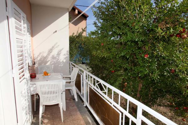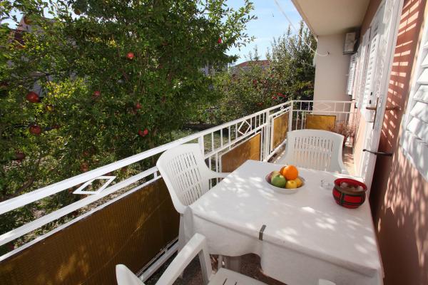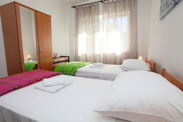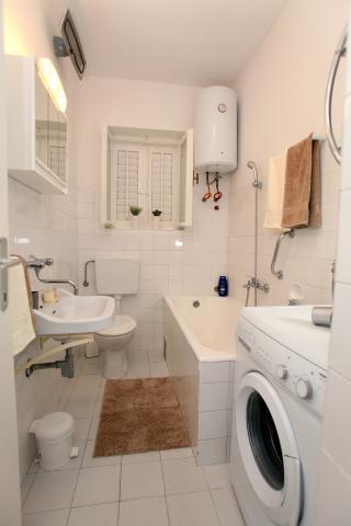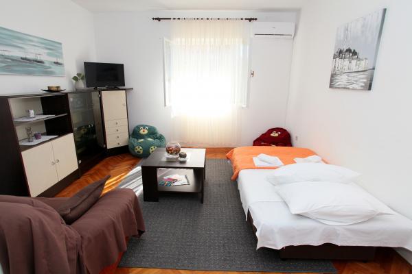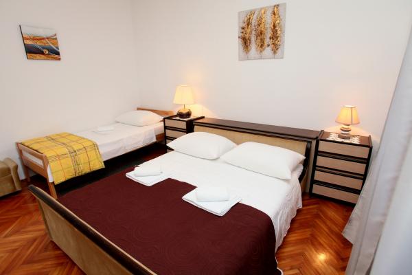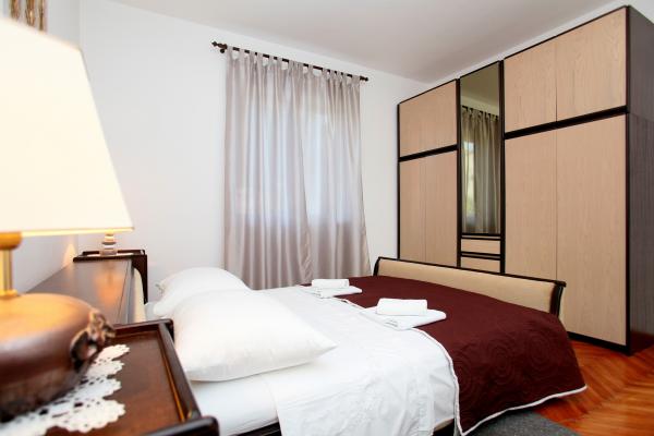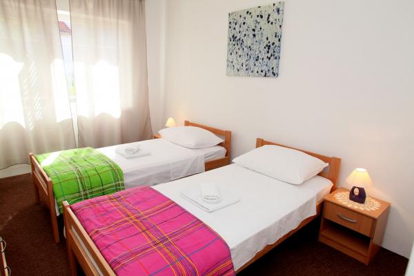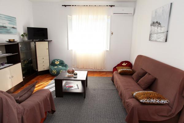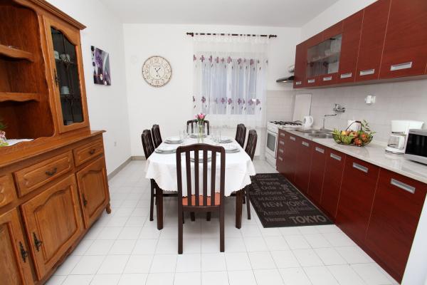 A lakás 80 m2-es, kényelmes és zöldövezetben található és a családi ház az óváros közelében (kb 10 perc séta). A lakás teljesen felszerelt, és két hálószoba (egy hármas és egy dupla), konyha, nappali, fürdőszoba és egy kis WC-vel. A nappaliban van egy extra ágy két fő részére (click-clack). Apartman egy erkély asztallal és székekkel és terasz az apartman előtt egy asztal egy kellemes időtöltést az árnyékban. Az épület mögött van egy kis grill és ingyenes parkolóhely két autó. A lakás klimatizált. Új állami kavicsos strand kb 500 m-re található. A legismertebb Trogir homokos strand két autóbusz-állomások és 1 km-re található. Trogir, vízparti, 20 percenként, megfizethető áron, a vezetés egy taxi hajóval a leghíresebb strandján Trogir területen.