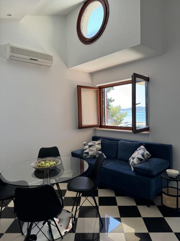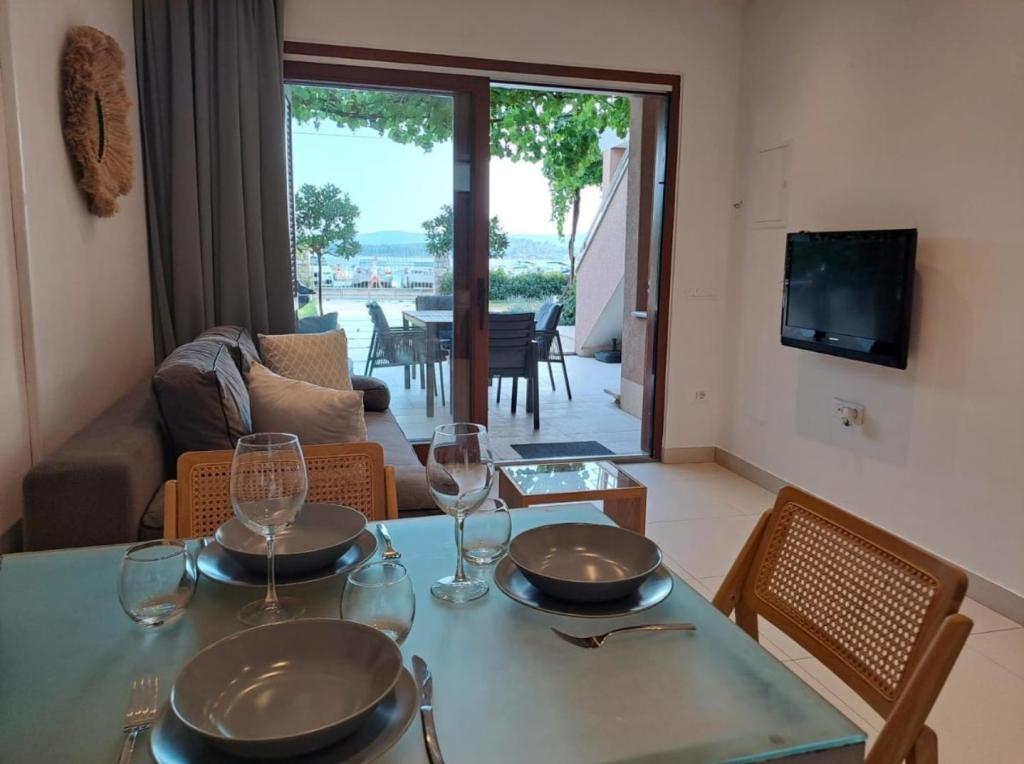 A teljesen és modernül felszerelt apartmanok a város csendes részén találhatók, az első sorban a tengertől. Az apartmanokhoz tengerre néző erkély vagy terasz, saját parkoló és kültéri terület tartozik. A strand, üzletek, éttermek, kávézók, pékség és egyéb létesítmények maximum 10 perc sétára találhatók, így minden, amire egy kellemes tartózkodáshoz szüksége van, gyalogosan is elérhető. A létesítmény különleges előnye a lakás előtt található privát csónakkikötő, amely akár 7 méter hosszú hajók számára is alkalmas. A csónak egy bójához és egy mólóhoz van kötve, ami biztonságos és egyszerű használatot tesz lehetővé. A szálláshely különösen alkalmas családok számára, akik nyugodt tengerparti nyaralásra vágynak, miközben minden szolgáltatás a közelben van autó használata nélkül.