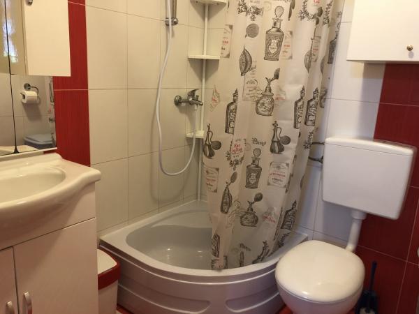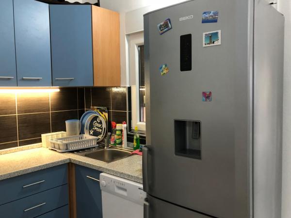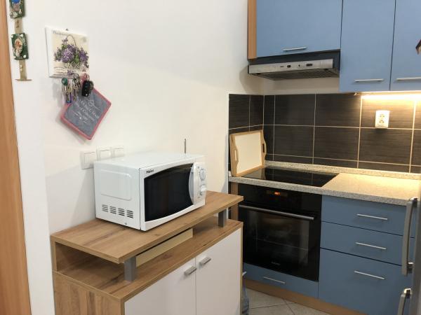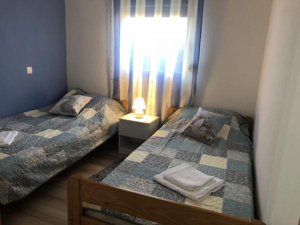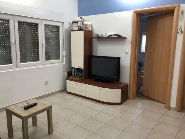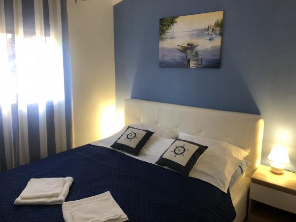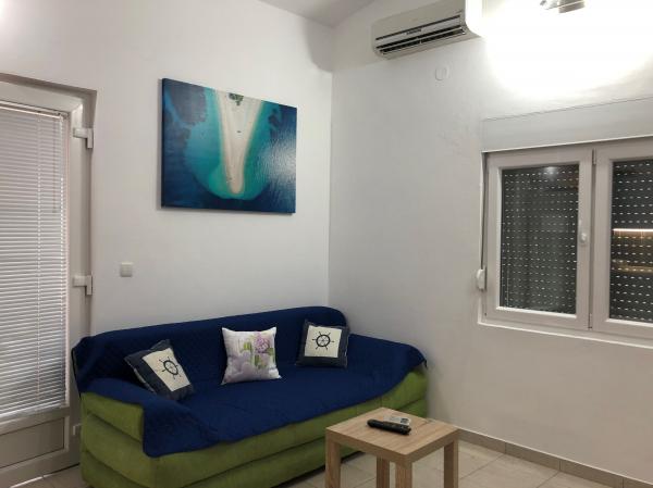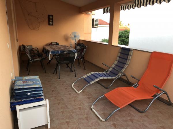 Korszerűen felszerelt apartman 200 m-re a strandtól és a sziget első részén található. Az apartman (60 m2) az első emeleten található, és két hálószobából áll (egy franciaágy és két különálló ágy). Tágas nappali konyhával, fürdőszoba, síkképernyős TV és WiFi internet. A konyhában mosogatógép, mikrohullámú sütő, nagy hűtőszekrény, vízforraló, sütő és főzőlap található. A tágas terasz (15 m2) napellenzővel rendelkezik és fedett; A teraszon nyugágyak és egy tágas, 6 személyes asztal található. Az apartmanon belül közös grillező és mosógép használatára van lehetőség. A lakásban lévő víz iható (a városi vízvezetékből). Parkolás az épületen belül biztosított. Dohányozni csak a teraszon lehet.