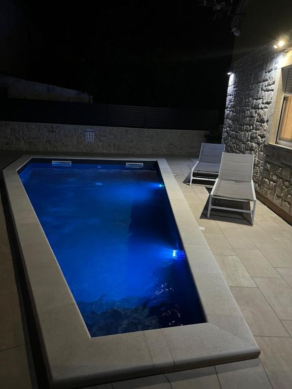 Ez az új nyaraló Vir szigetének kellős közepén található. A zaj és a kilátás elől rejtve. A házban 2 hálószoba található egy franciaággyal és egy franciaággyal a galérián. A teljes kapacitás 6 fő. Ezenkívül két fürdőszoba található, az egyik a tetőtérben, a másik a földszinten, mosógéppel és ruhaszárítóval. A konyha is minden géppel felszerelt. Az udvaron fedett terasz, grillező és játszótér található. Parkolás a vendégek rendelkezésére áll, valamint egy hely a garázsban. Minden szomszéd megfelelő távolságra van, és magánéleted van. Ha a központban szeretne lenni, közel minden létesítményhez, de mégis rejtve, ez a ház a megfelelő választás az Ön számára. Várjuk érkezését.