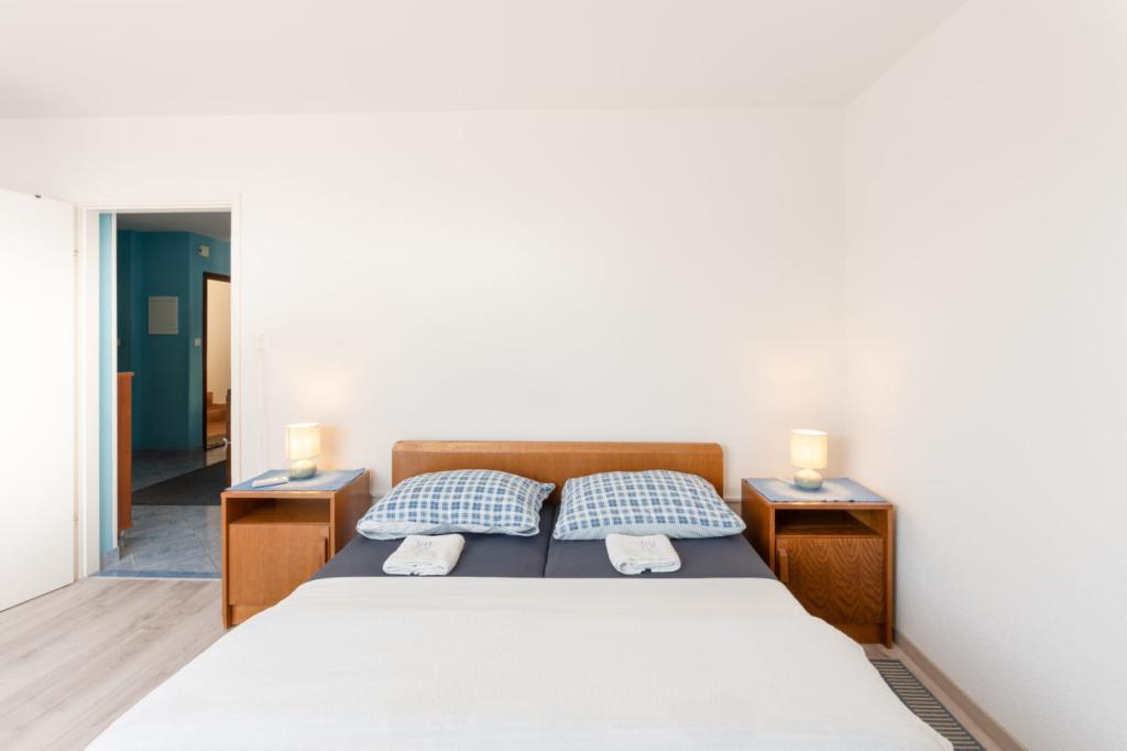 Teljesen felszerelt, három hálószobás, 90 m²-es, tengerre néző apartmanok 4-6 fő részére alkalmasak. A vendégek rendelkezésére áll egy nagy, fedett parkoló, akár 4 autó számára, valamint grillező és nyárs az udvari teraszon. Az apartmanok a városközponttól 500 méterre, a strandtól pedig 5-10 perc sétára (kb. 400 m) találhatók. Az apartmanok ára tartalmazza a Wi-Fi internetet, a légkondicionálót, a fedett parkolót, a grillező használatát és az idegenforgalmi adót. Az apartmanok elsősorban családok számára készültek. Kérjük az érdeklődőket, hogy ajánlatkérés küldése előtt ellenőrizzék az "Elérhetőség" és az "Árlista" részeket. Telefonos foglalás nem lehetséges. Köszönjük megértésüket.