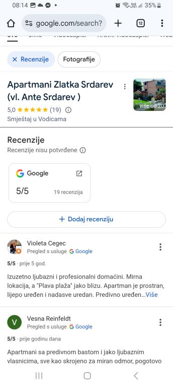 Az Apartments Zlatka Srdarev Vodice városának Blata néven ismert csendes részén található. a Punta szálloda közelében. A fő strand mindössze 150 méterre, a városközpont pedig 300 méterre található a Zlatka apartmantól. Az apartmanok egy privát utcában helyezkednek el, gyönyörű növényzettel és mediterrán növényekkel körülvéve, mint olajfák, szőlő, füge, kivi... Büszkélkedhetünk azzal, hogy kétszer is elnyertük a legjobb parkosított kert díját. A vendégek használhatják a grillezőt. Apartmanjaink teljesen különállóak egymástól, és minden apartmanhoz saját terasz tartozik. A vendégek az udvaron belül parkolhatnak. Gyere és érezd jól magad velünk!