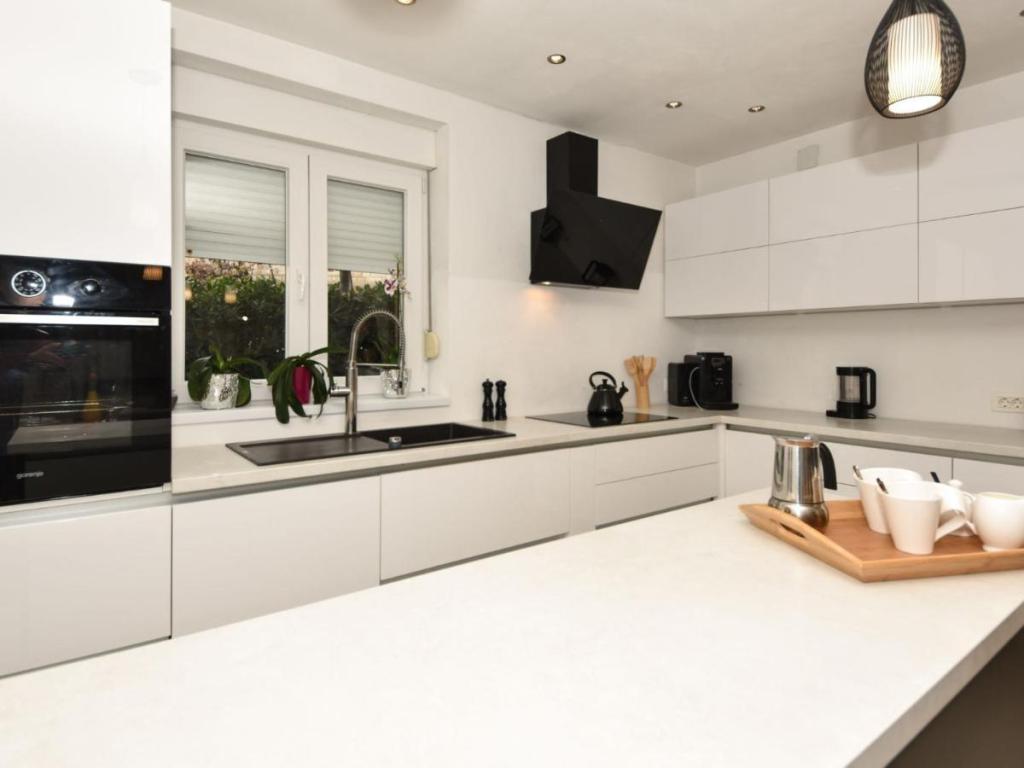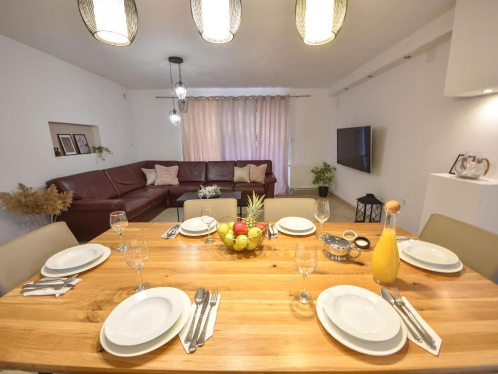 "Villa Matino" családi ház, 2 szintes. 400 m-re Ražanac központjától, csendes, napos, magaslati helyen, 440 m-re a tengertől, 440 m-re a strandtól. Magánhasználatra: 500 m2-es telek (bekerített), sarokmedence (8 x 4 m, 32 m2, mélység 145 cm, szezonális rendelkezésre állás: május 15. - október 15.) belső lépcsővel. Kerti zuhany, grillező, a medence karbantartását a tulajdonos/kertész végzi. A házban: ingyenes internet-hozzáférés, mosógép. Parkolás 3 autó számára a ház mellett a telken. A tulajdonos nem fogad fiatalabb csoportokat. Az egész házban összesen 4 légkondicionáló található. A ház összesen 250 m2-es, 2 szinten. 2 apartmanból áll, amelyeket szettként bérelnek (ideális csoportok számára, mert külön térrel/privát térrel, valamint közös társalgóval rendelkeznek a társasági élethez). Az egyik apartman kisebb, és 2 hálószobából (mindegyikben egy nagy, 180x200 cm-es franciaágy), 1 konyhából, 1 étkezőből, 1 nappaliból, 1 fürdőszobából és 3 teraszból (2 tengerre néző) áll. Nagyméretű TV-vel, ingyenes internettel az egész épületben, mosógéppel rendelkezik.