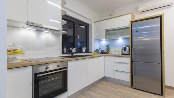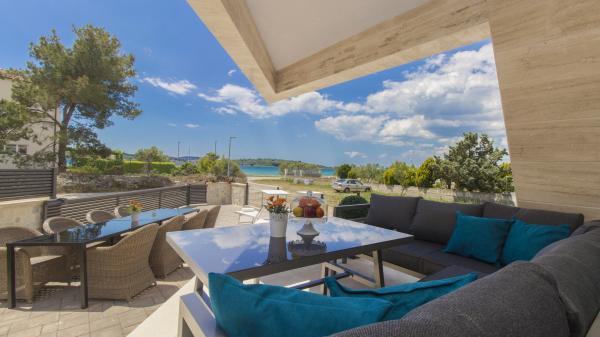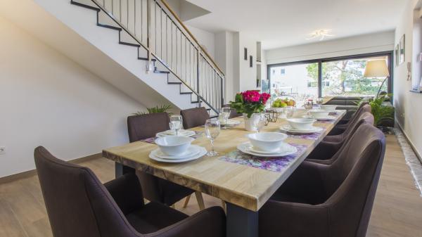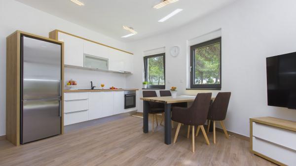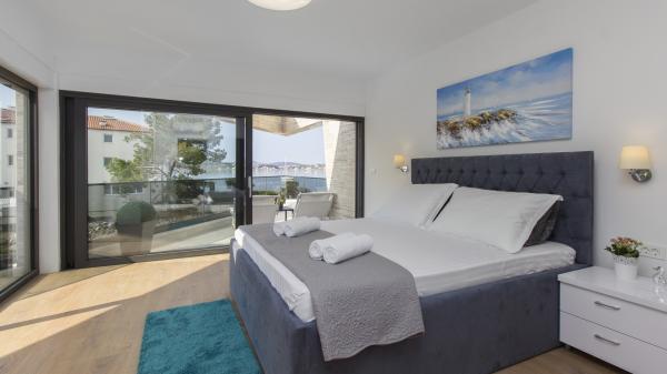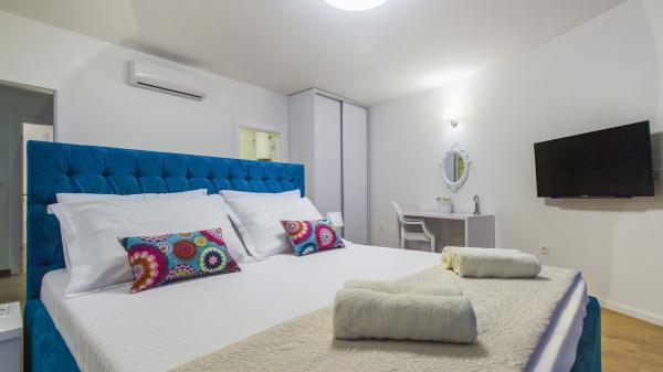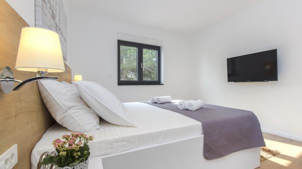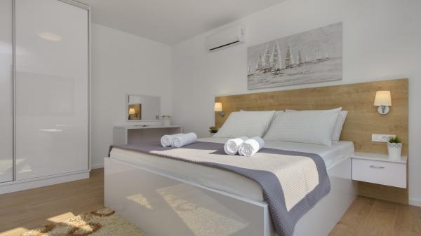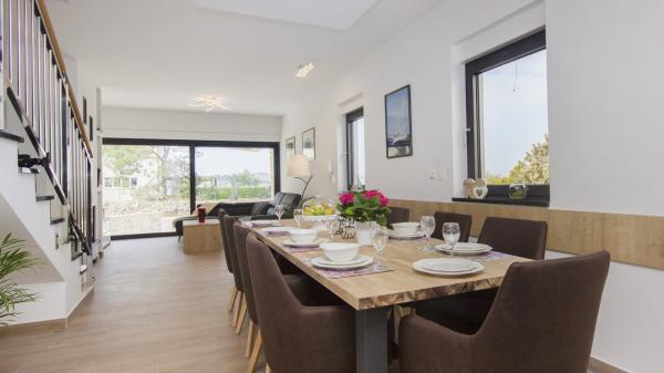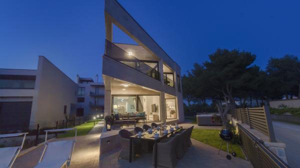 A Villa Okit egy újonnan épült és modern villa, amely mindössze 50 méterre fekszik Srima homokos strandjától, 3 km-re Vodicétől, 13 km-re Šibeniktől. A földszinten van egy konyha, nappali és nappali, amely egy egységet és egy külön fürdőszobát tartalmaz, a nappaliból terasz és egy parkosított udvar, kerti bútorokkal és napozóterülettel. A konyha teljesen fel van szerelve az edények és italok elkészítéséhez szükséges eszközökkel és konyhasarokkal. A földszinten egy külön hálószoba, egy hálószoba, fürdőszoba, konyha és étkező található, ahol kiléphet az udvarról. A ház első emeletén 4 hálószoba és 3 fürdőszoba található. Hálószoba 1, 20m2 saját fürdőszobával és kijárat erkélyre, 180X200 ágy, TV. Hálószoba 2, 25m2, saját fürdőszobával és kijárat erkéllyel, 180X200 ágy, TV. Hálószoba 3 és Spoke 4 közös fürdőszobával rendelkezik, mindegyik 15m2-es, mindegyikben 180x200 ágy, öltöző és TV található. Kerítésű udvar napozóterülettel és kerti bútorokkal, parkolóhely.